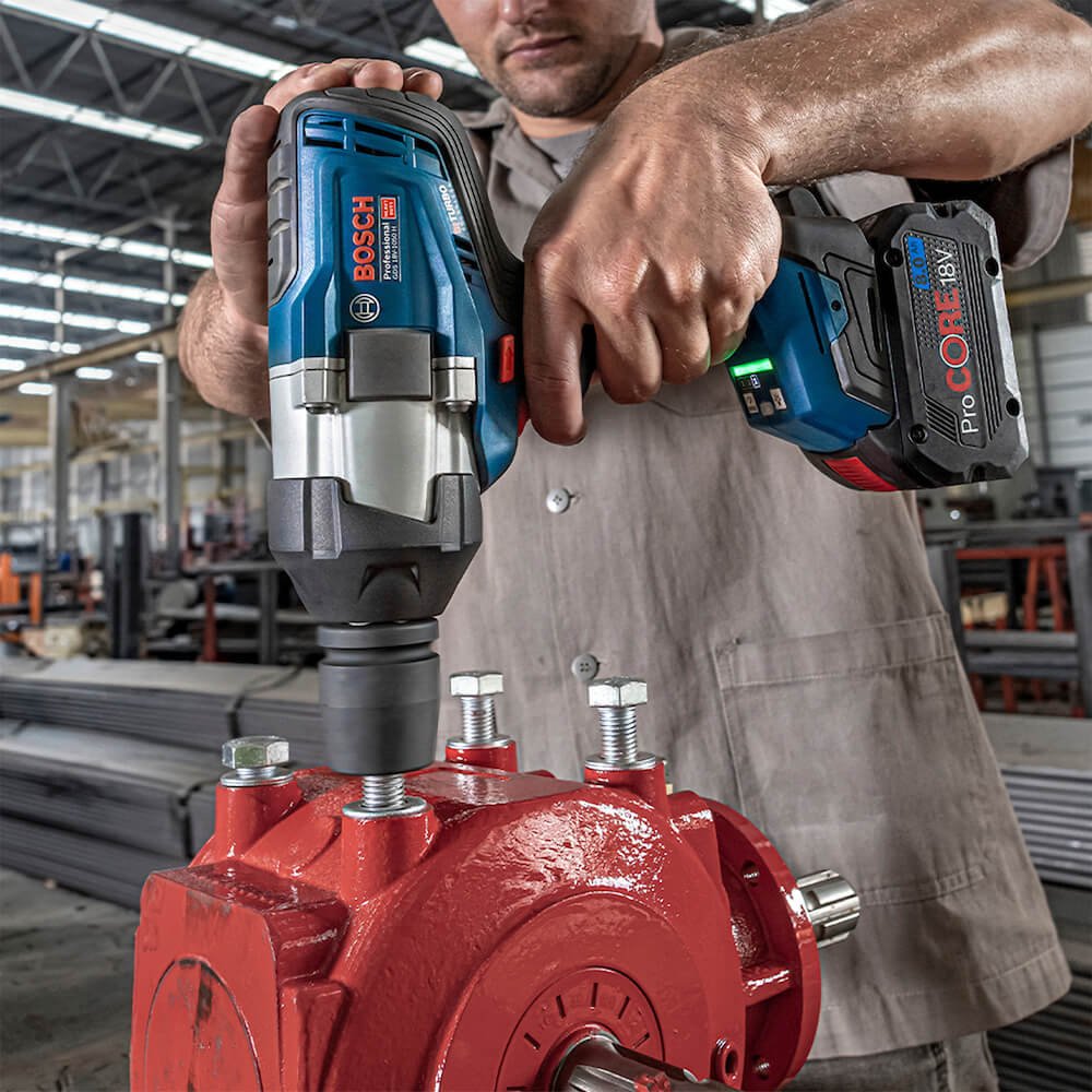A Chave de Impacto BITURBO Bosch GDS 18V-1050 H é extremamente potente! Tem mesma potência de uma ferramenta a cabo: 1.050 Nm de aperto e 1.700 Nm de reversão. Seu encaixe de 3/4“ com anel de fricção e furo para pino de retenção proporciona um melhor travamento do acessório. A Chave de Impacto Bosch GDS 18V-1050 H tem três configurações de velocidade para um preciso controle de torque, oferecendo maior versatilidade em diferentes aplicações. Possui LED indicador de temperatura da bateria e da ferramenta para monitorar em caso de sobreaquecimento.