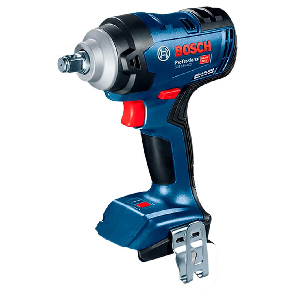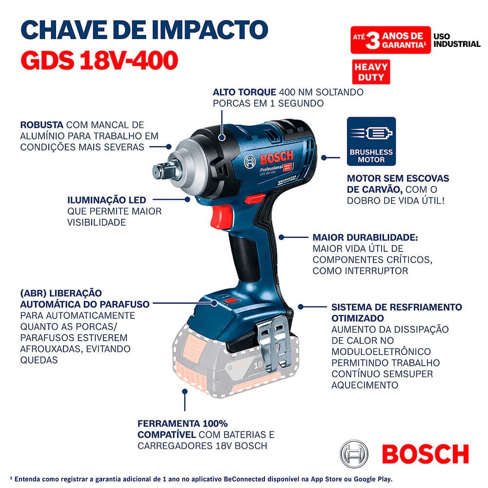 A Chave de Impacto a Bateria Bosch GDS 18V-400 possui alto torque de 400Nm e motor Brushless sem escovas de carvão, que traz o dobro da vida útil e é livre de manutenção. Essa ferramenta é robusta, com mancal de alumínio para trabalhos em condições severas. Com nova tecnologia em Chaves de Impacto chamada 'ABR - Auto Bolt Release' ou 'Liberação automática do parafuso', a Chave de Impacto a Bateria Bosch GDS 18V-400 apresenta maior produtividade durante aplicações de desmontagem, fazendo com que a ferramenta pare automaticamente de funcionar quando as porcas já estiverem afrouxadas; evitando assim, a queda das porcas e parafusos. Ferramenta compatível com todas as baterias e carregadores Bosch 18V.