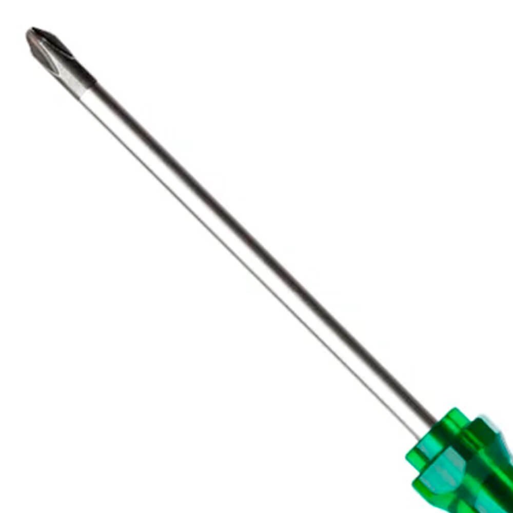 Chave Phillips® com cabo PVC translucido verde ergonômico com ponta oxidada para evitar descascamento e proporcionar mais segurança. Possui a haste toda temperada com acabamento niquelado e cromado. Ideal para uso profissional pesado, seu cabo ergonômico rígido e resistente injetado em PVC na cor verde transparente deixa aparente a profundidade que a haste está garantindo máxima qualidade e resistência para o trabalho diário.