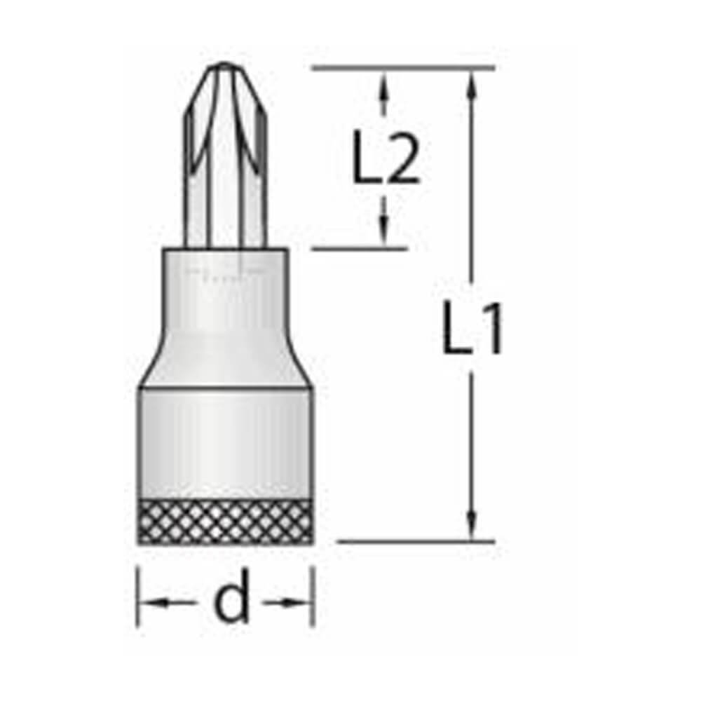 Aço Gedore-Vanadium. Soquete com acabamento niquelado e cromado/ zincado branco, com ponteira escurecida. Para trabalhar com acessórios manuais com encaixe quadrado 12,7 mm (1/2”), conforme DIN 3120 - C 12.5, ISO 1174. Indicada para parafusos com perfil de encaixe tipo fenda cruzada "Phillips".