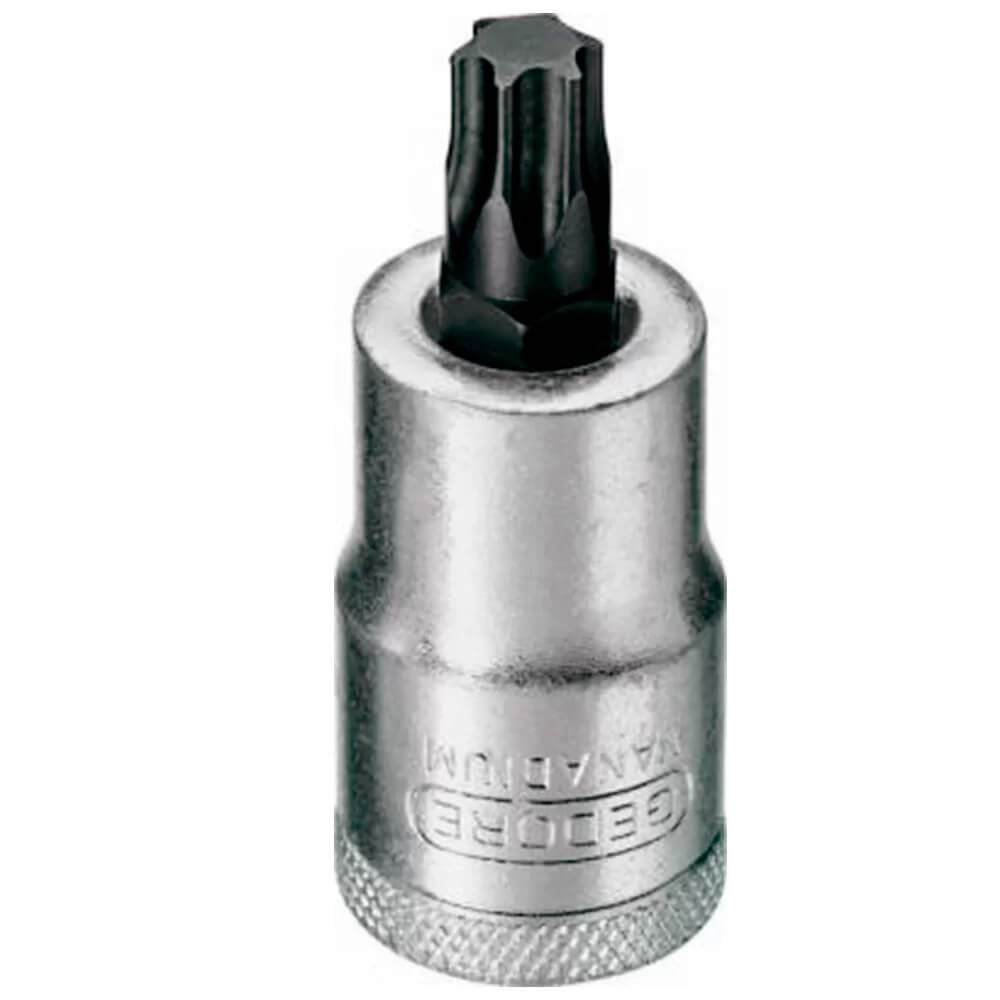 Aço Gedore-Vanadium. Soquete com acabamento zincado branco/ niquelado e cromado, com ponteira escurecida. Para trabalhar com acessórios manuais com encaixe quadrado 12,7 mm (1/2”), conforme DIN 3120 - C 12.5, ISO 1174. Indicada para parafusos com geometria GTX (perfil hexalobular) interno.