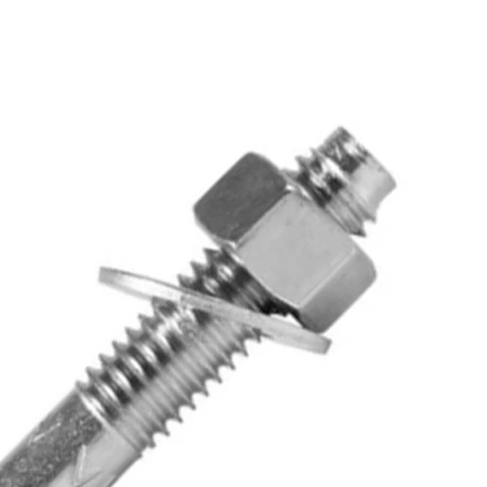 Chumbador de expansão controlada por torque, composto por parafuso, arruela, jaqueta e cone. Prolongador incluso, conforme comprimento.