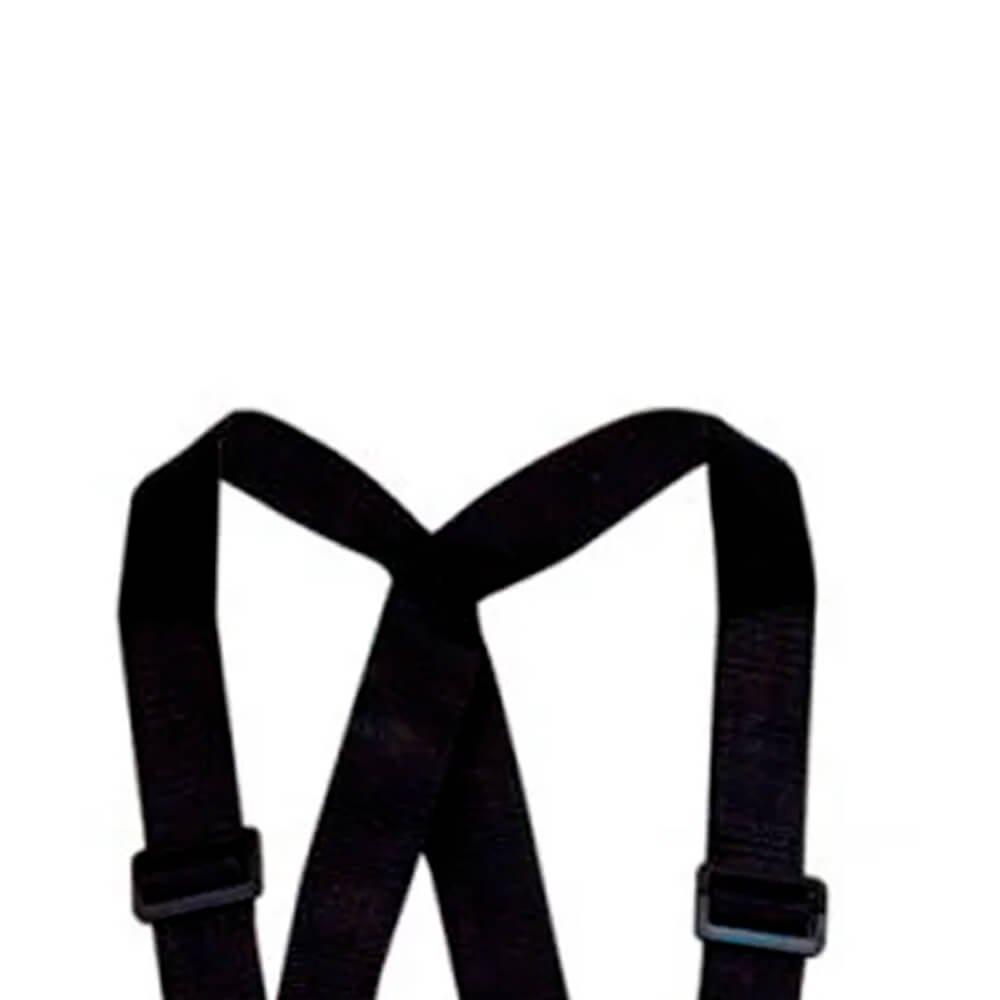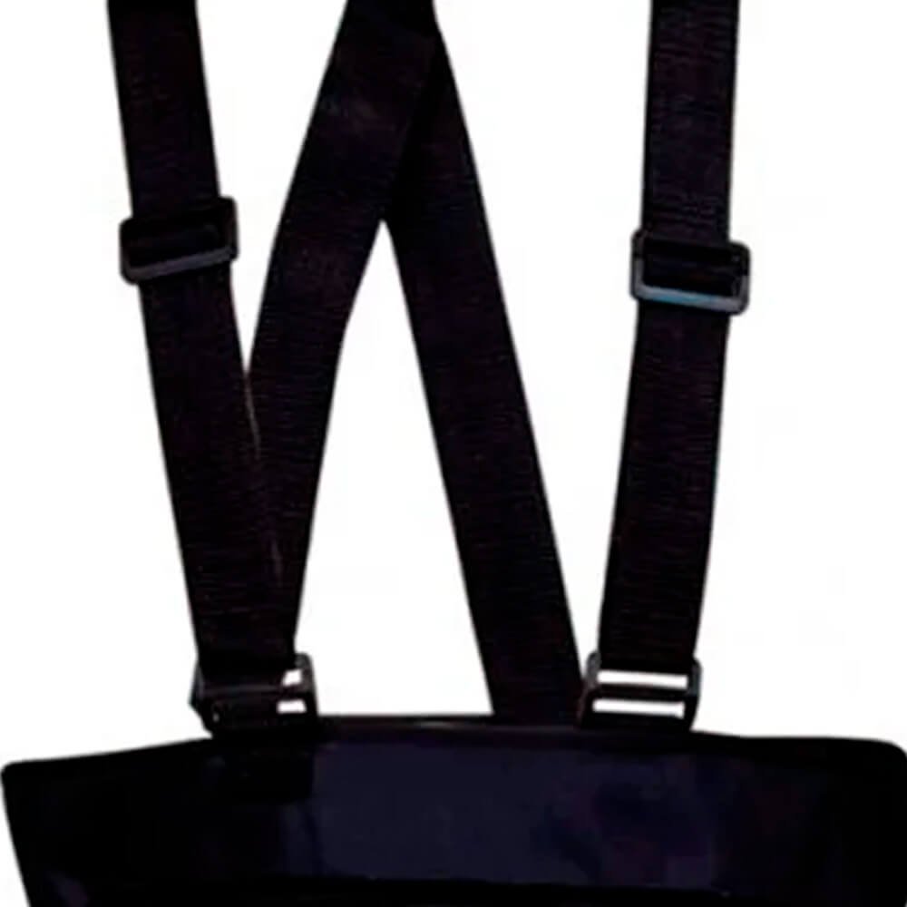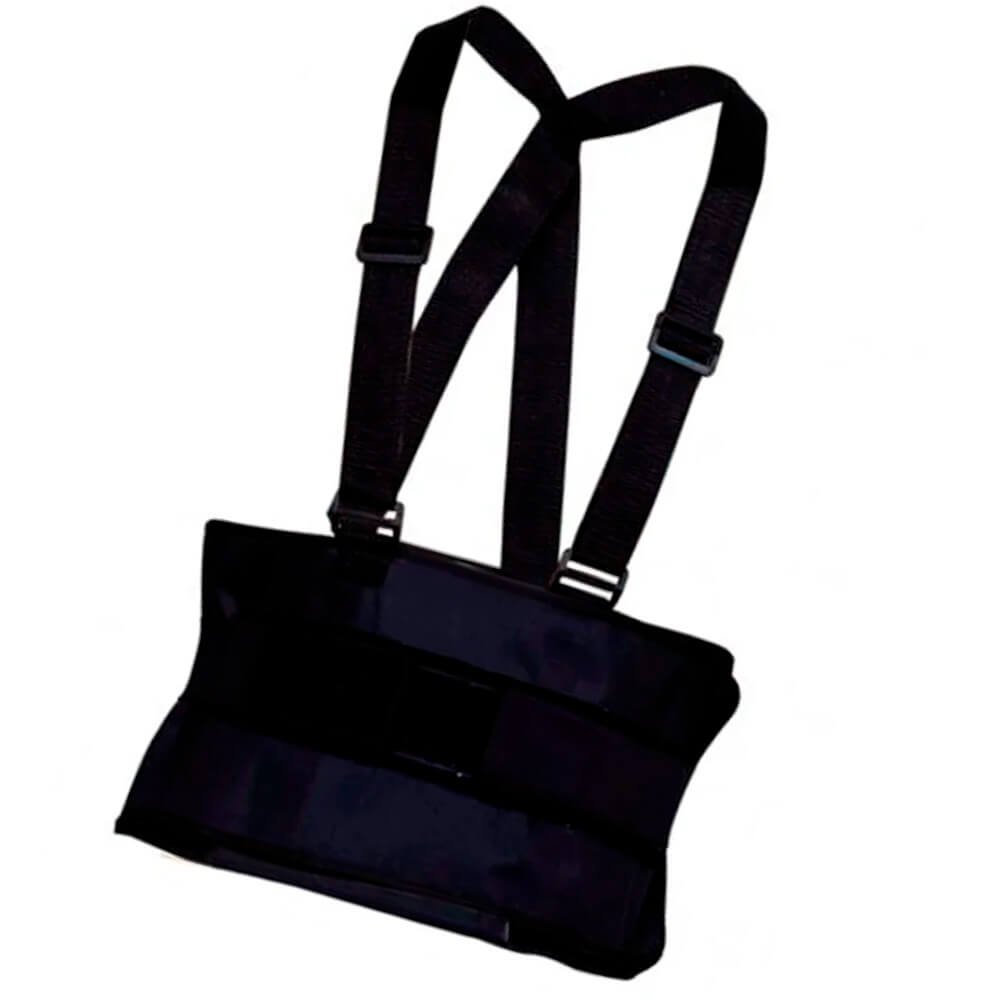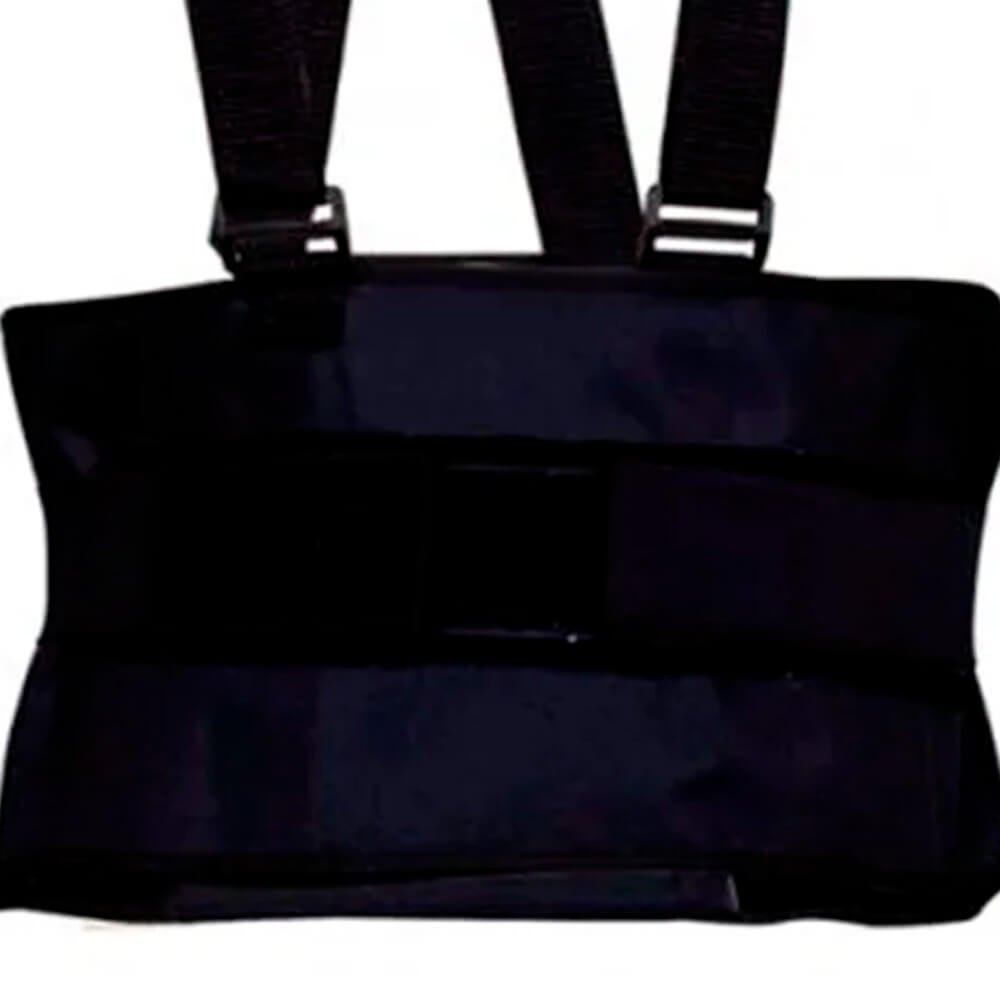 Cinto lombar ergonômico com alças ajustáveis, confeccionado em material sintético, com alças em nylon e passadores plásticos para ajuste.