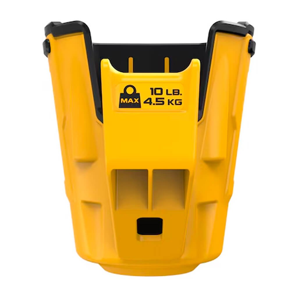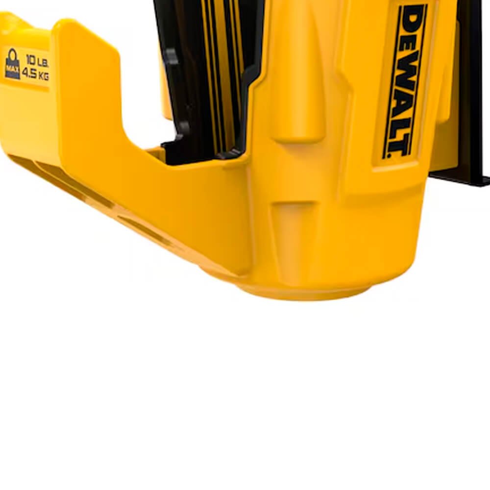 COLDRE PARA FERRAMENTA ELÉTRICA DEWALT, feito de plástico resistente, suporta até 4,5 kg e é ideal para ferramentas 20V MAX ou 12V MAX. Monta-se facilmente nos trilhos metálicos DEWALT e possui sistema de travamento patenteado para maior segurança.