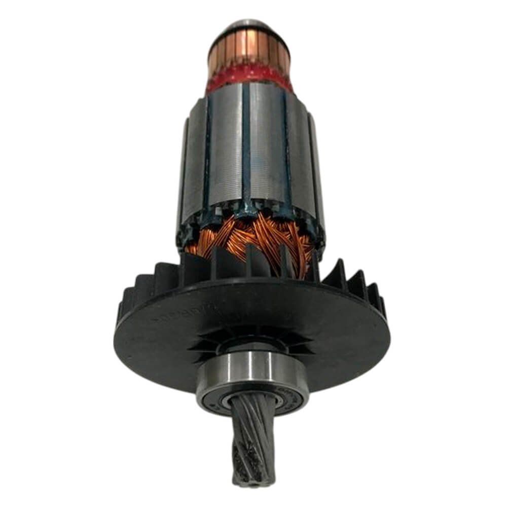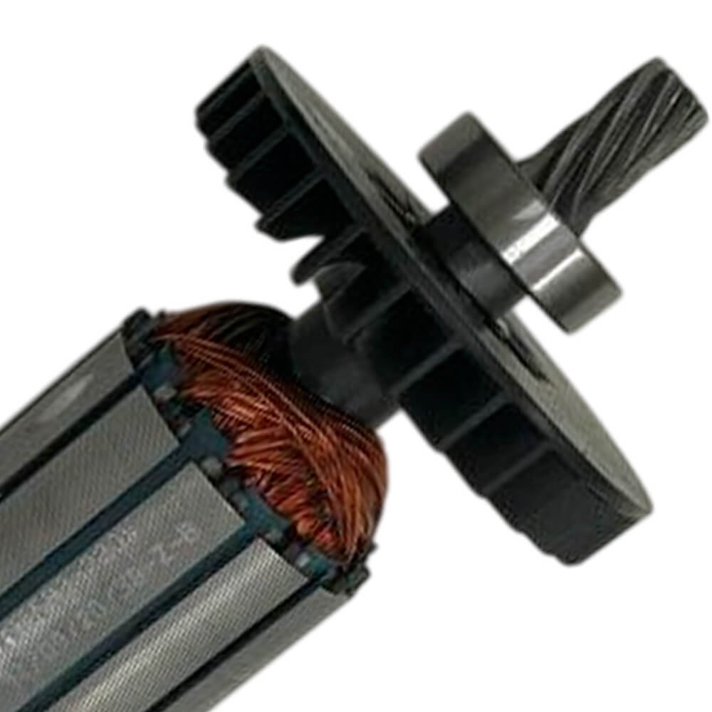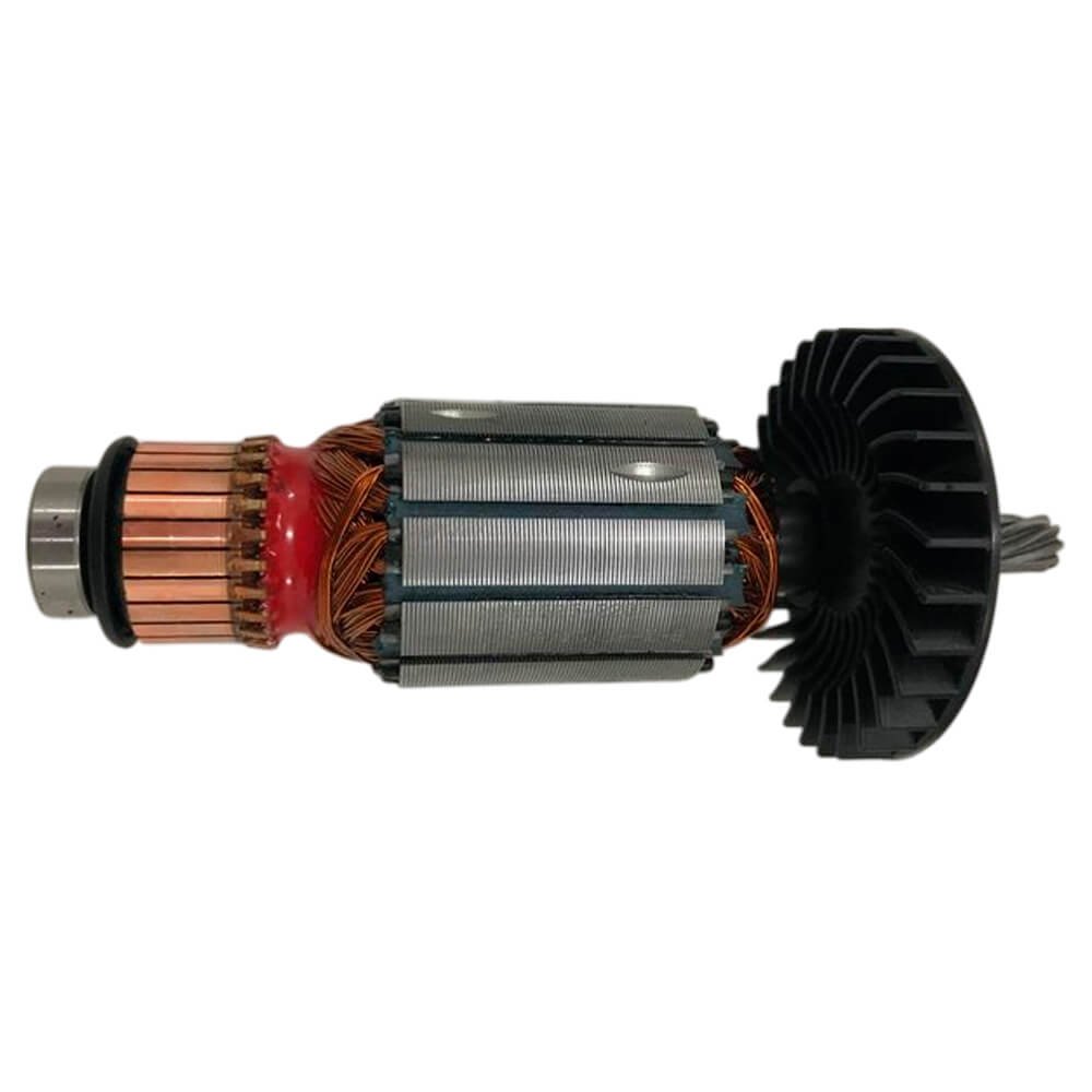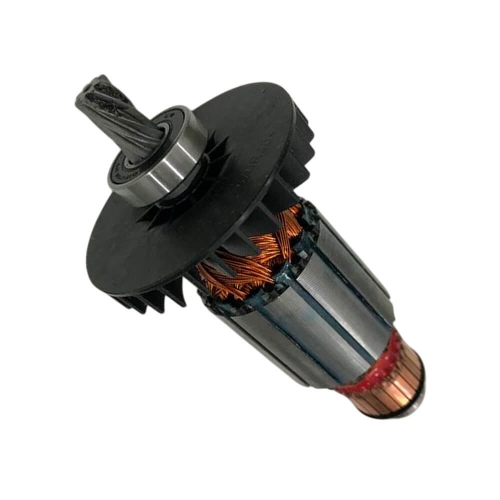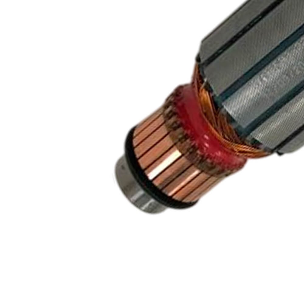 Induzido também conhecido como rotor, usado em conjunto com o estator ou bobina de campo, rolamentos e escovas de carvão.
