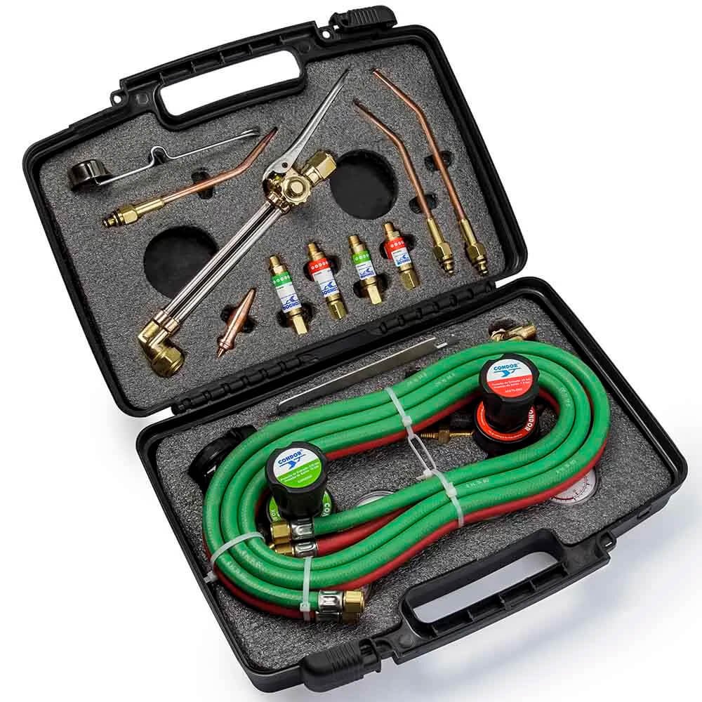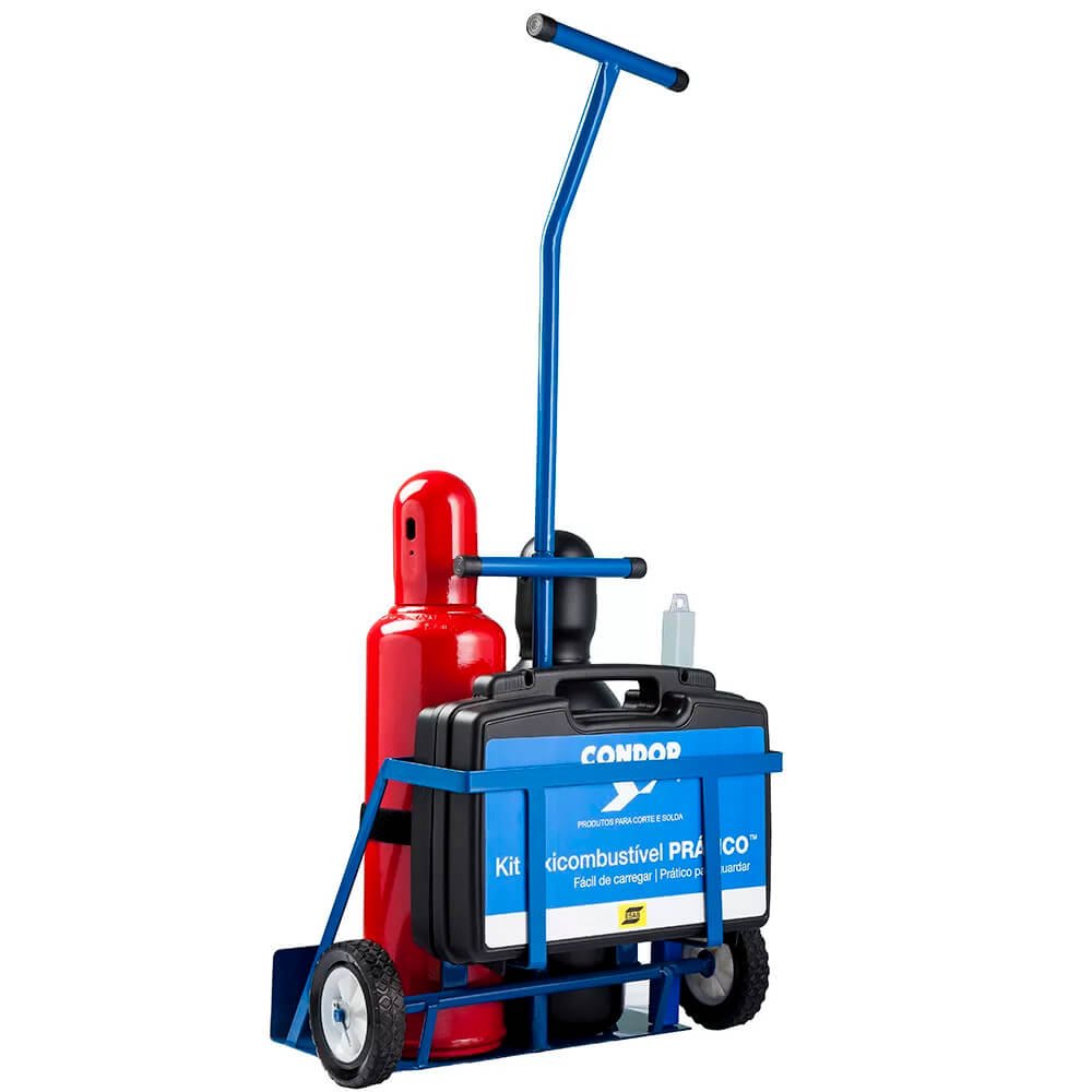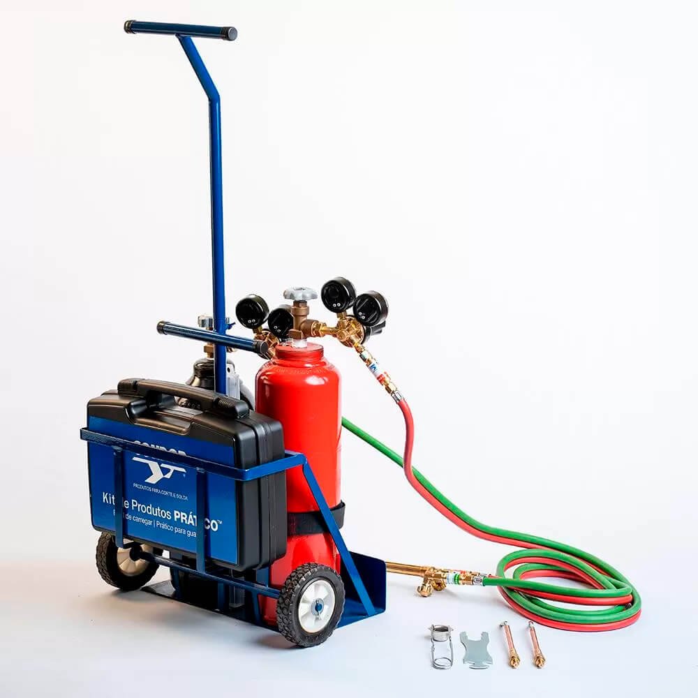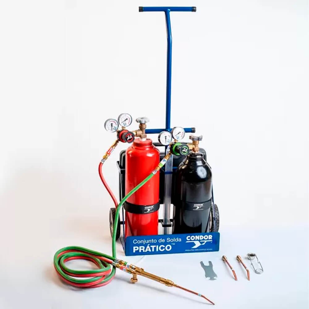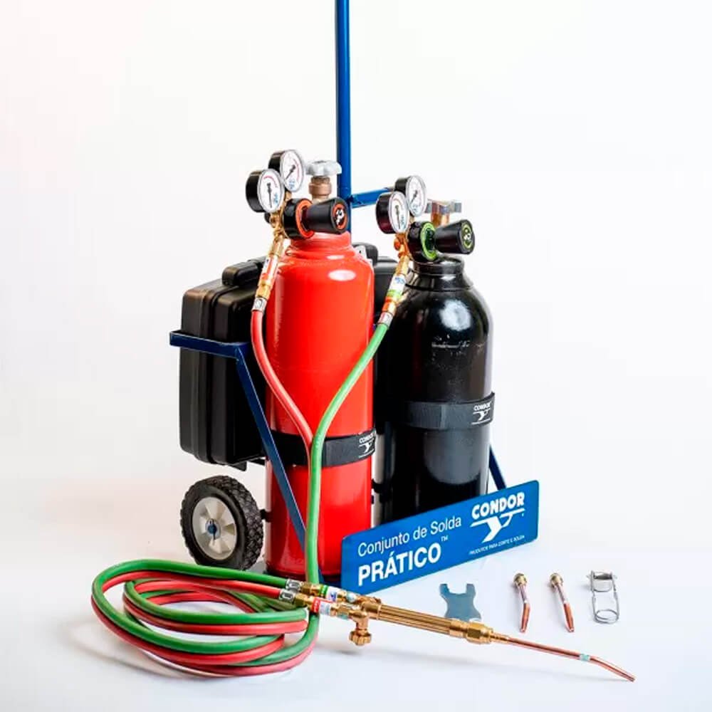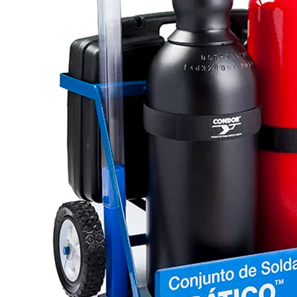Conjuntos de Solda Prático Oxigênio/Acetileno CONDOR realmente práticos onde basta carregar os cilindros de gases e iniciar a operação. Importante para a mobilidade do operador e versatilidade do serviço. Utilizado no processo de Solda com Acetileno. Tendo como característica roda de borracha para piso irregular e alto impacto, proporcionando maior resistência e durabilidade ao equipamento. Possui porta varetas de solda que permite proteger contra a oxidação prematura. Incluso chave de boca multifuncional, aplicável em todas as porcas do equipamento (montar e desmontar as partes necessárias do conjunto). Tamanho ajustável da haste que ajuda no armazenamento do produto e no transporte com maleta organizacional que protege os produtos e cinta de ajuste de cilindros em Velcro, adaptável em todas as espessuras de cilindro.