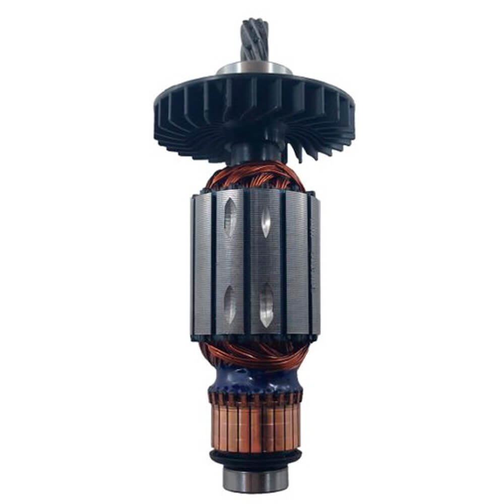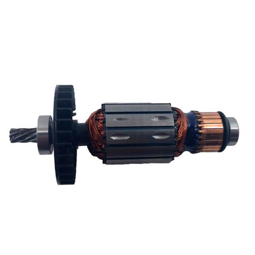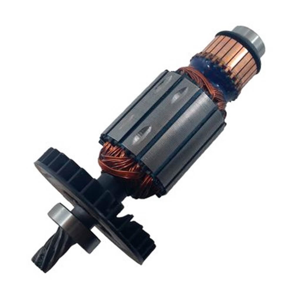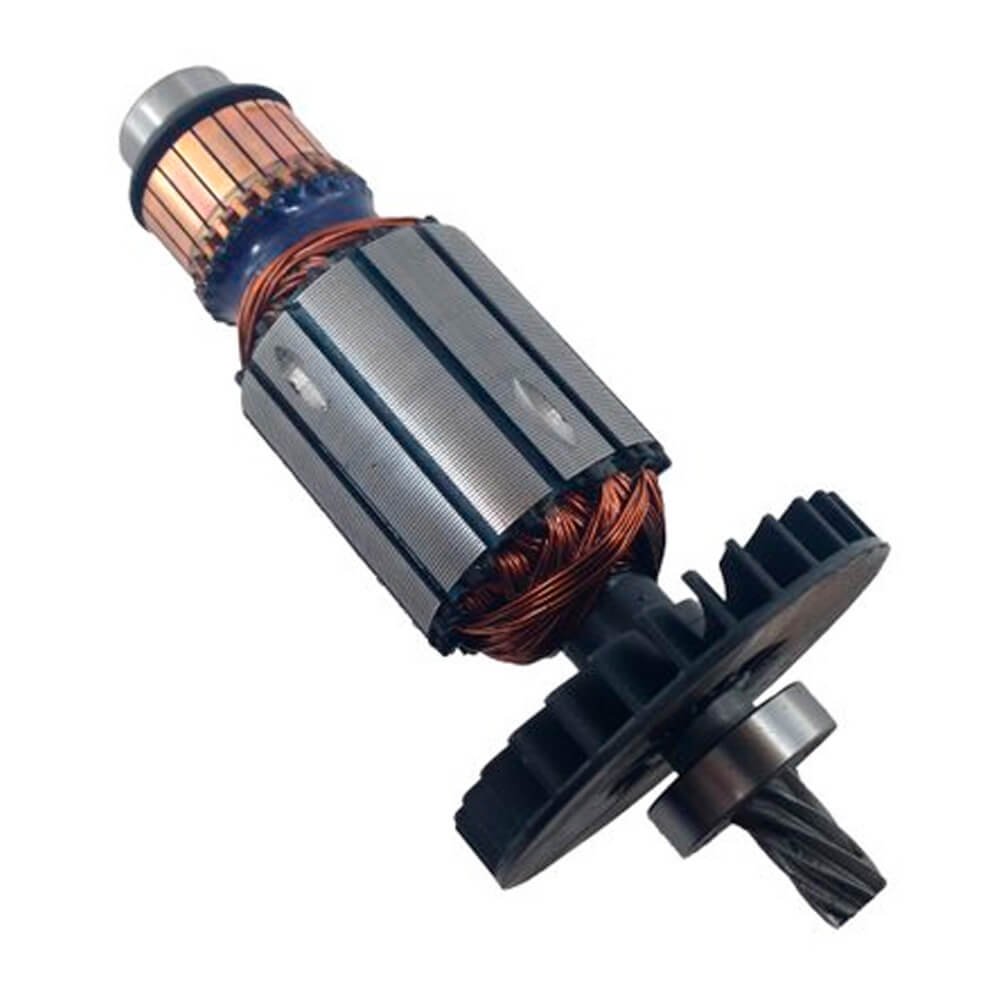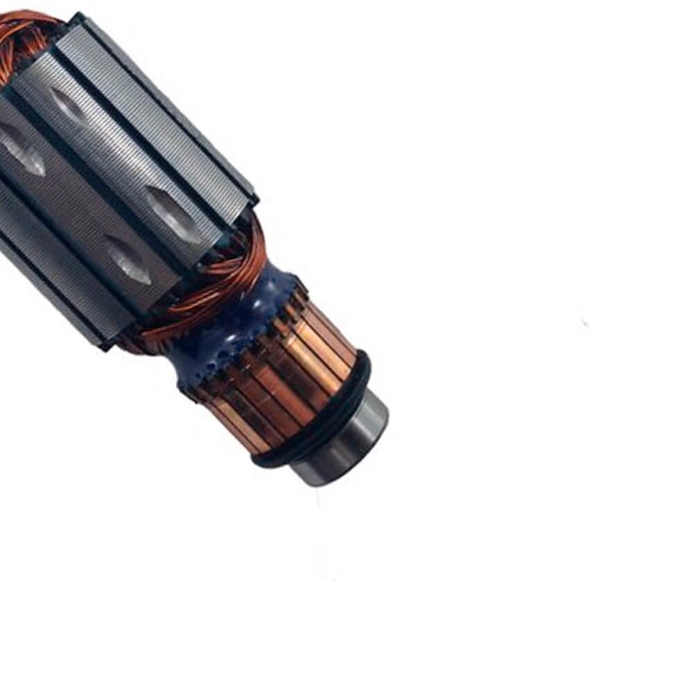 Induzido também conhecido como rotor, usado em conjunto com o estator ou bobina de campo, rolamentos e escovas de carvão.