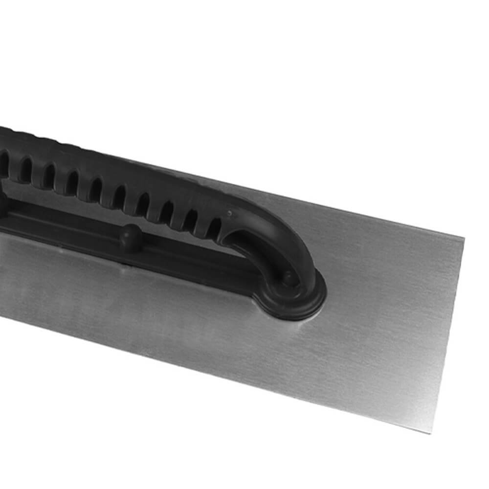 Nivelar paredes com massa corrida, cimento, massa para textura, auxiliar na colocação da massa para pisos e azulejos. Fabricada em aço carbono especial de alta qualidade e com acabamento metalizado, cabo em polipropileno e formato anatômico, fixação do cabo a base de solda capacitiva, base de aço 100% lisa sem marca de ribites.