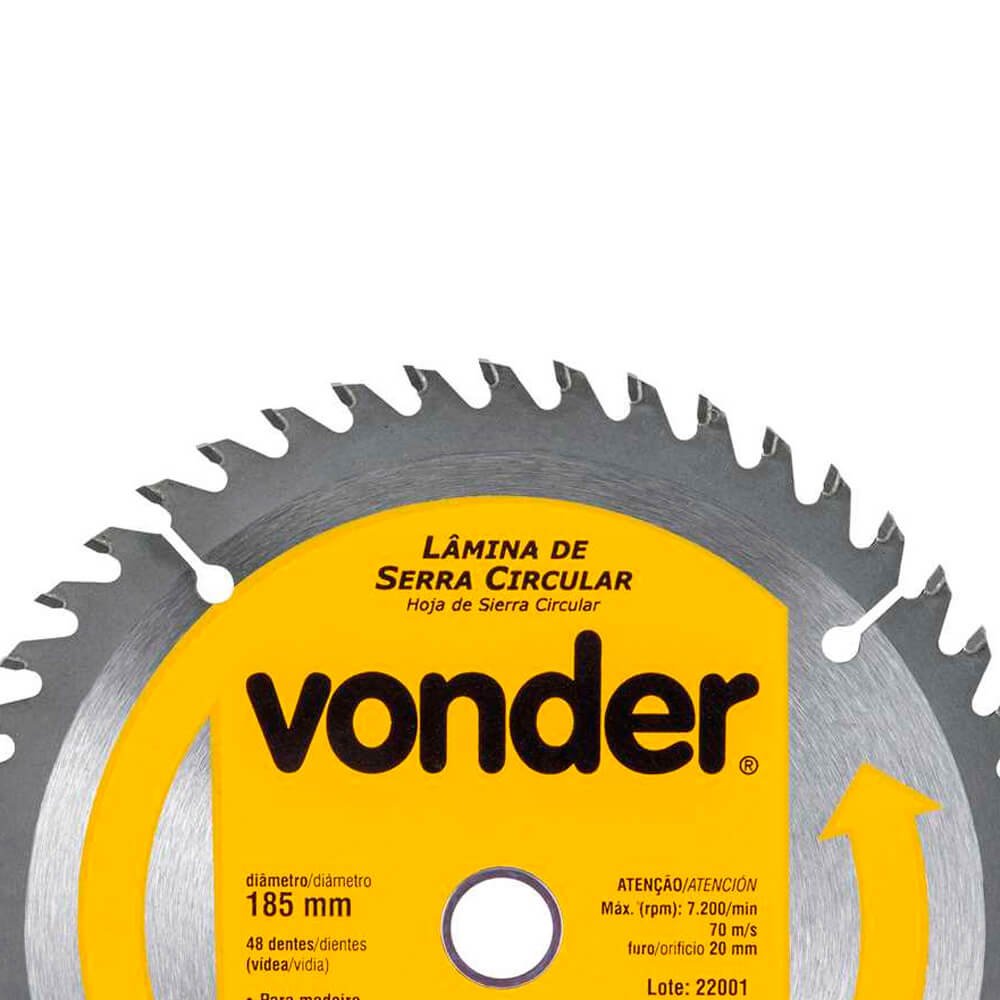 Indicada para cortar madeiras. Nunca exceder a rotação máxima (rpm) - risco de acidente e/ou queima da lâmina. Não cortar madeiras impregnadas com massa ou cimento. Para cortes em MDF, a vida útil da serra e o nível de qualidade do acabamento serão reduzidos. A Vonder disponibiliza em seu mix, serras apropriadas para cortes em MDF.
