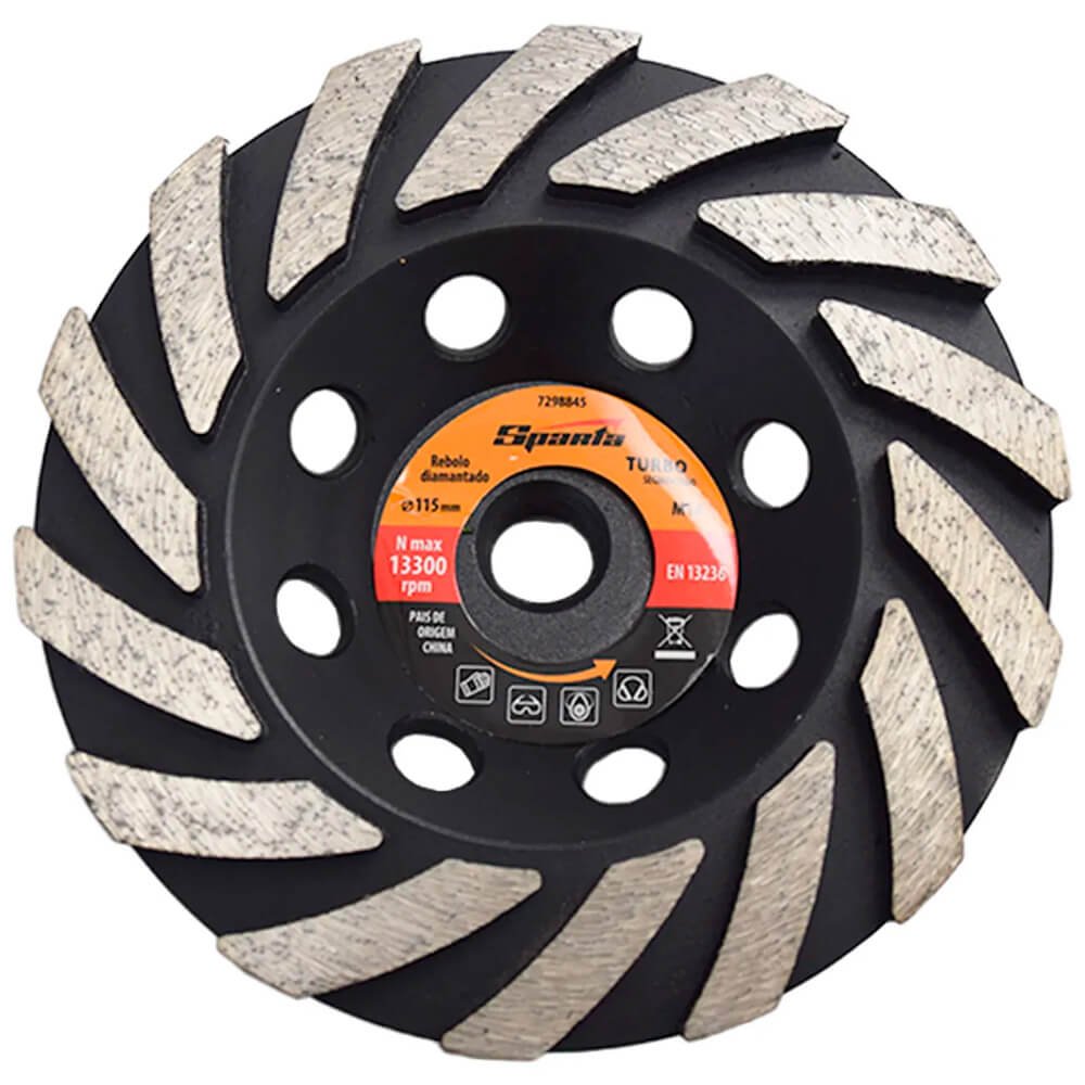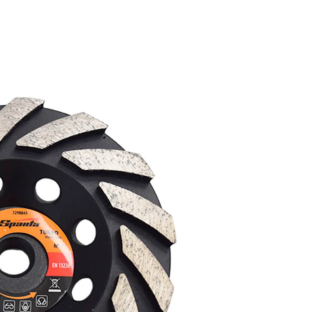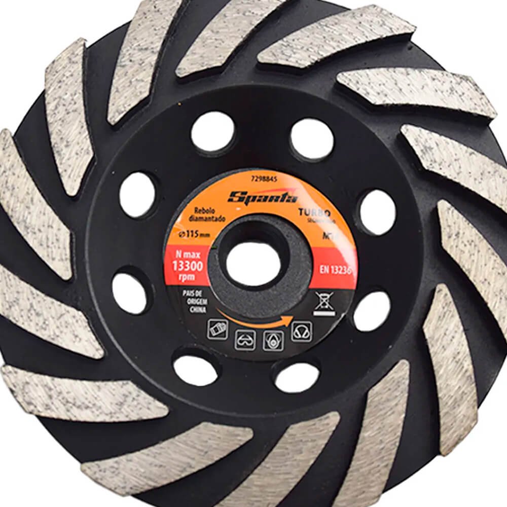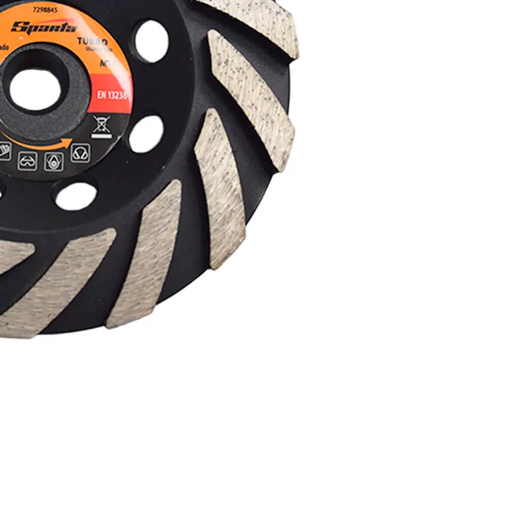 O Rebolo diamantado 115 mm segmentado turbo da Sparta é ideal para realizar um processamento grosseiro (são necessárias várias passagens) e uma retificação fina para tornar o material liso. O rebolo diamantado turbo/segmentado foi projetado para limpar e retificar concreto, mármore, granito e outros materiais.
