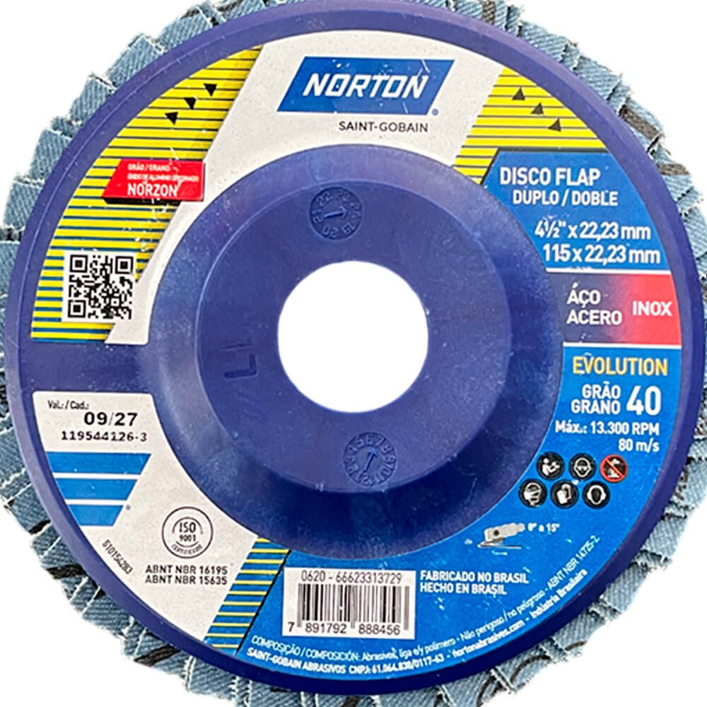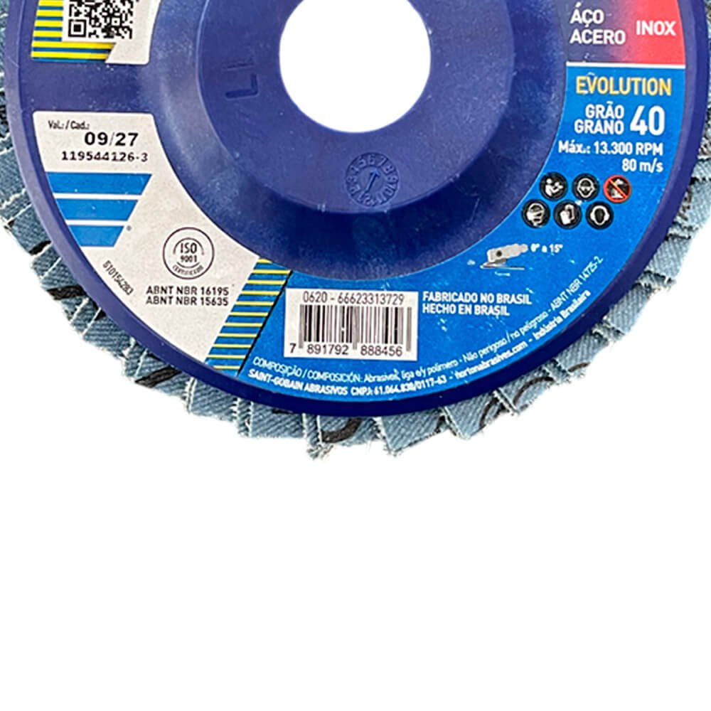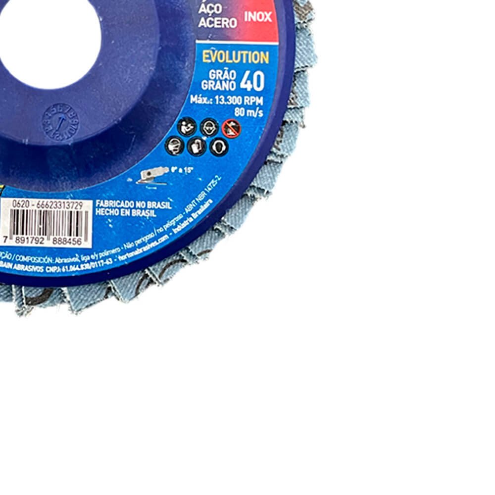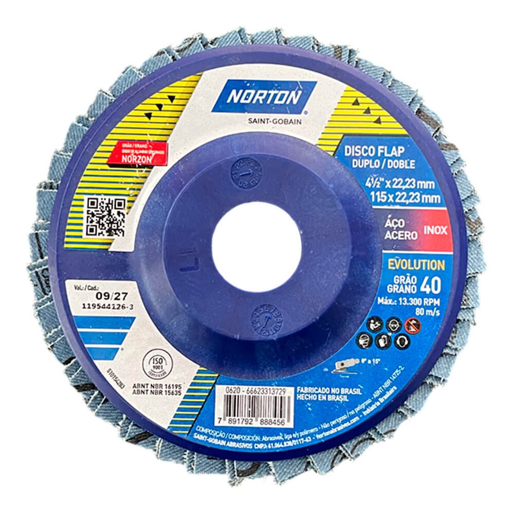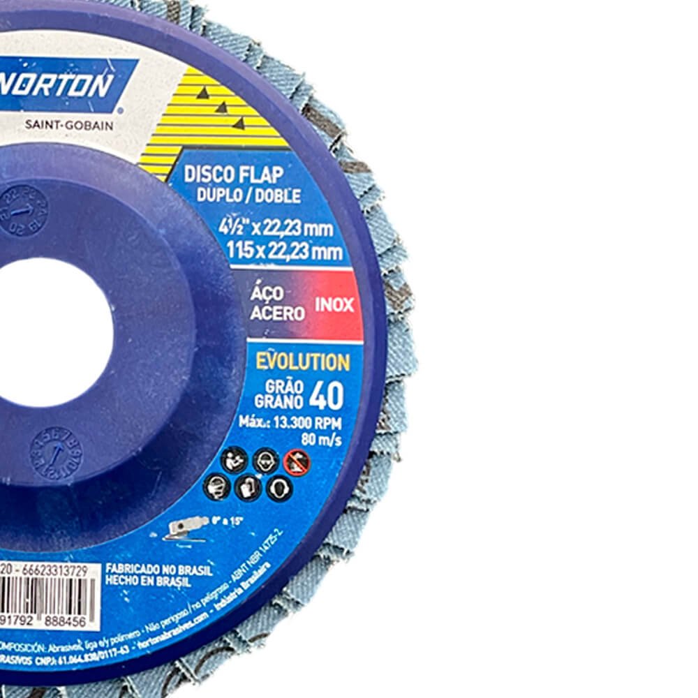 O Flap-Disc Evolution é um disco composto por aletas de lixa com costado de tecido, aplicadas em suporte externo de plástico, e grão Norzon, que promove excelente poder de remoção. Desbasta e dá acabamento ao mesmo tempo, eliminando a troca de discos em trabalhos que exijam as duas operações. Indicado para desbaste de soldas, rebarbação, eliminação de corrosão.