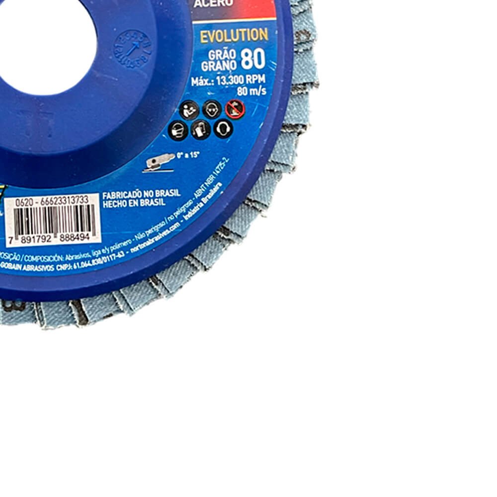 O Flap-Disc Evolution é um disco composto por aletas de lixa com costado de tecido, aplicadas em suporte externo de plástico, e grão Norzon, que promove excelente poder de remoção. Desbasta e dá acabamento ao mesmo tempo, eliminando a troca de discos em trabalhos que exijam as duas operações. Indicado para desbaste de soldas, rebarbação, eliminação de corrosão.