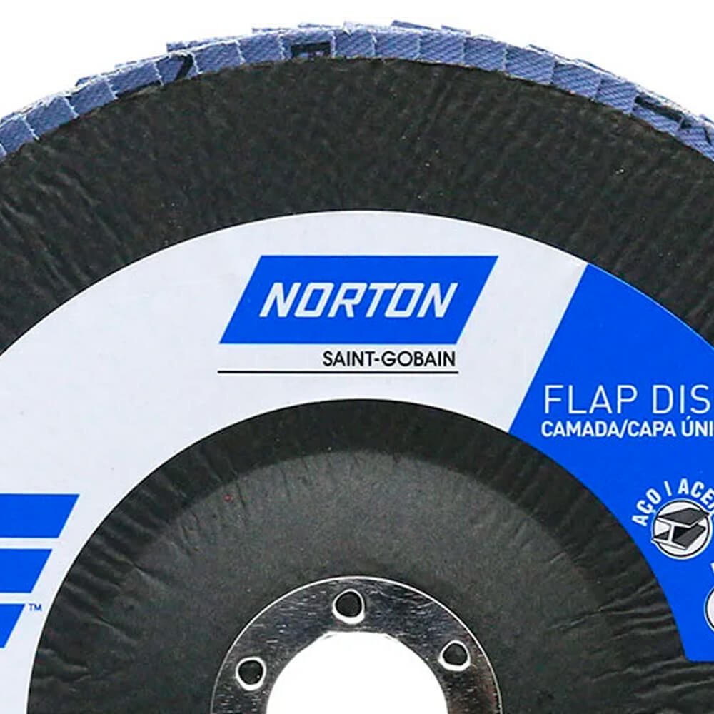 O Flap Disc Norton Original é um disco composto por uma camada de aletas de lixa com costado de tecido e grão Norzon (tecnologia Saint-Gobain que proporciona excelente poder de remoção) aplicados em suporte externo de fibra. Desbasta e dá acabamento ao mesmo tempo, eliminando a troca de discos em trabalhos que exijam as duas operações. Indicado para desbaste de soldas, rebarbação, eliminação de corrosão.