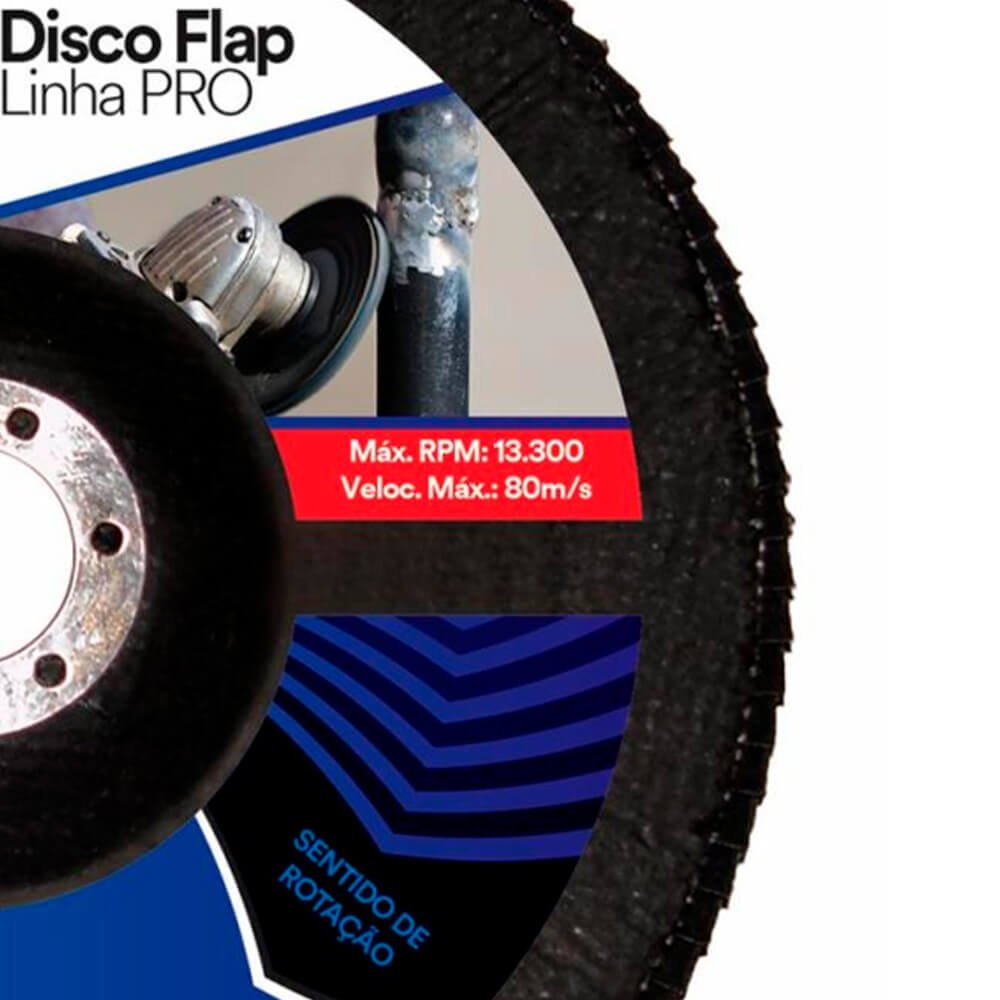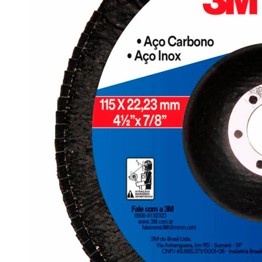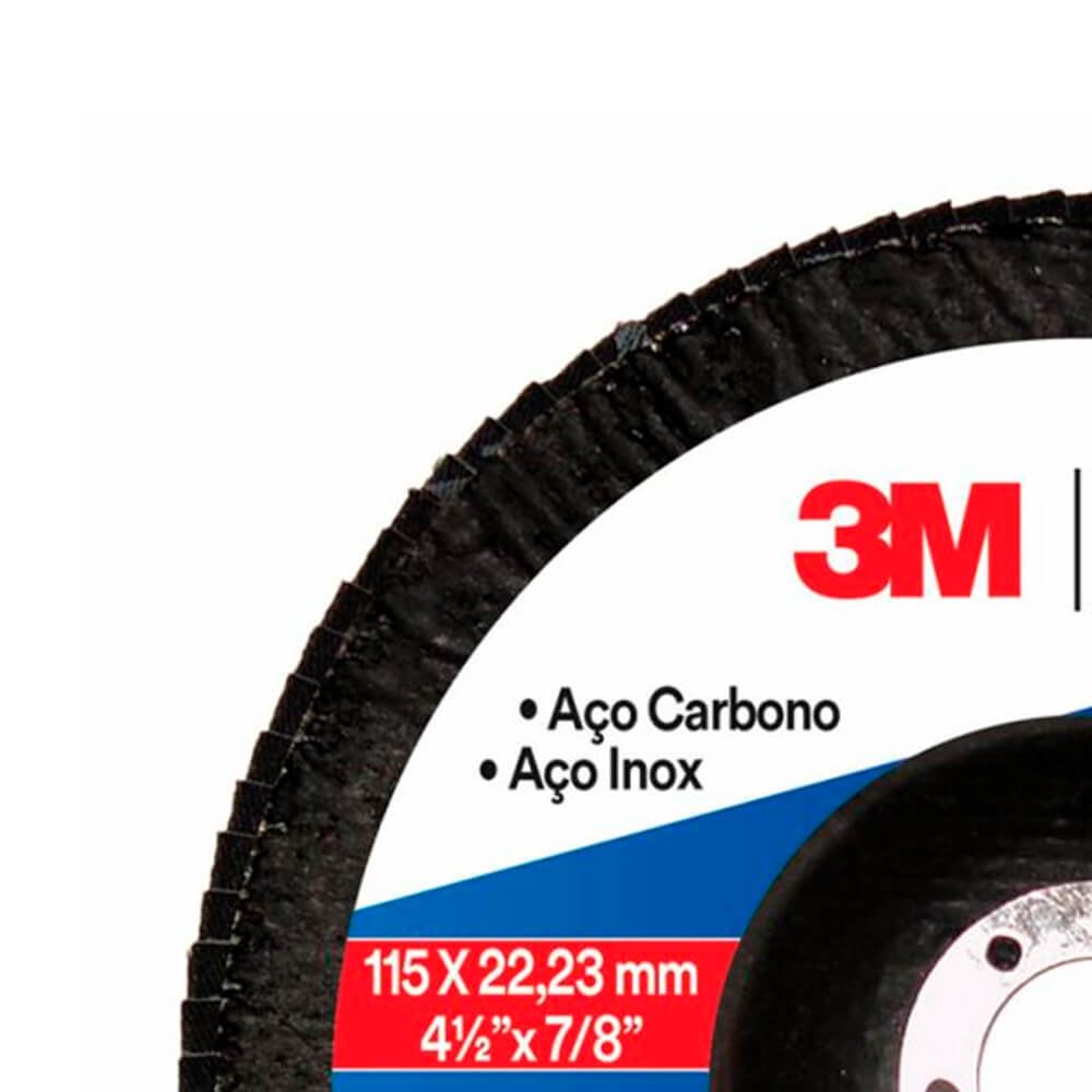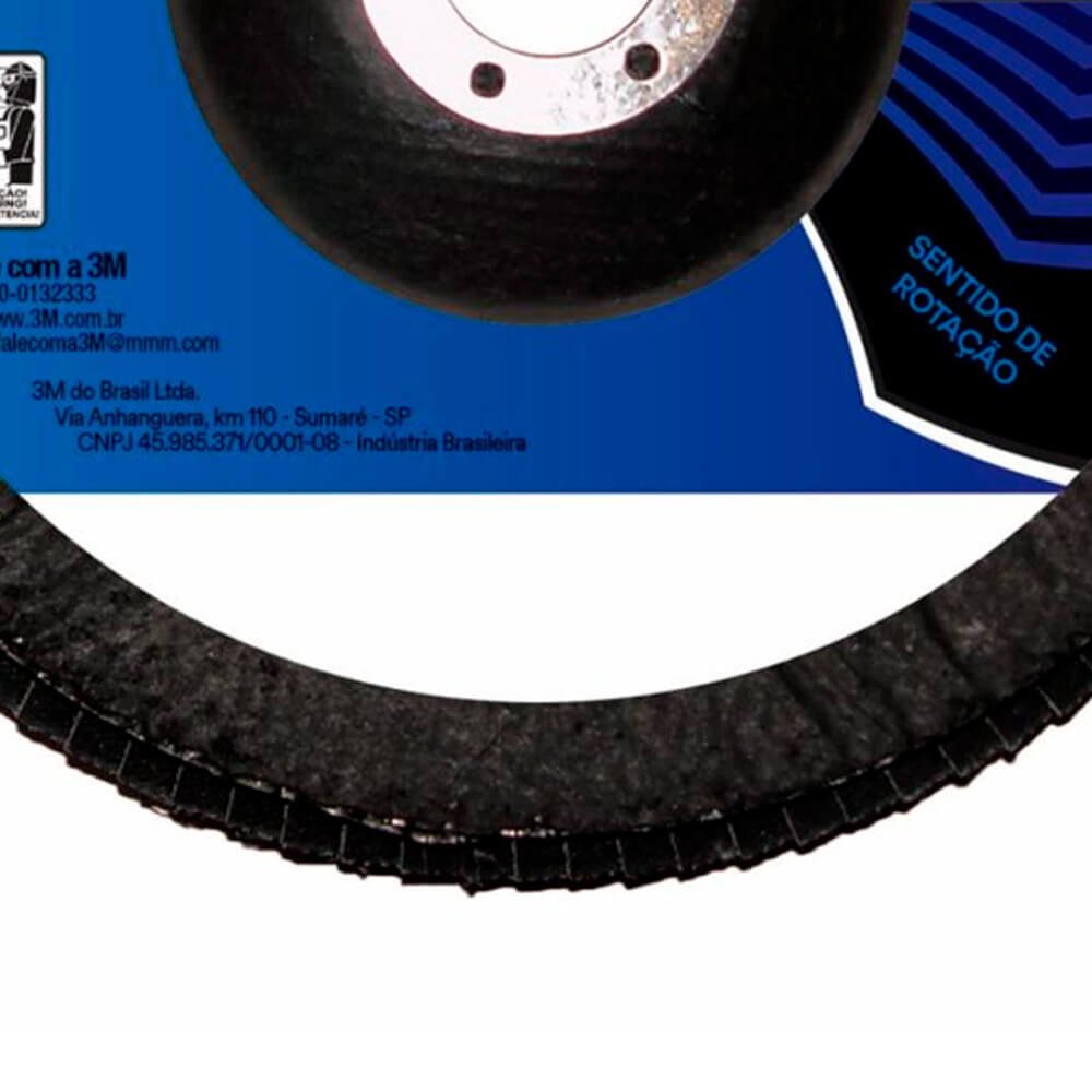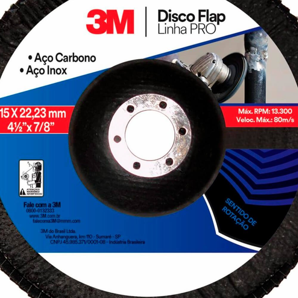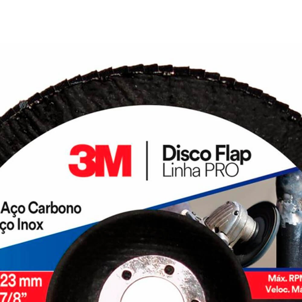 O Disco Flap 3M™ PRO oferece segurança ao operador para operações de desbaste e acabamento e está em conformidade com as normas da ABNT NBR ISO 16195 e NBR ISO 15635. Também é utilizado para remoção de defeitos em chapas metálicas, rebarbação, remoção de respingos de soldagem e limpeza de superfícies metálicas. Está disponível nos minerais óxido de alumínio zircônia ou óxido de alumínio, nos grãos 40, 60, 80 e 120.
