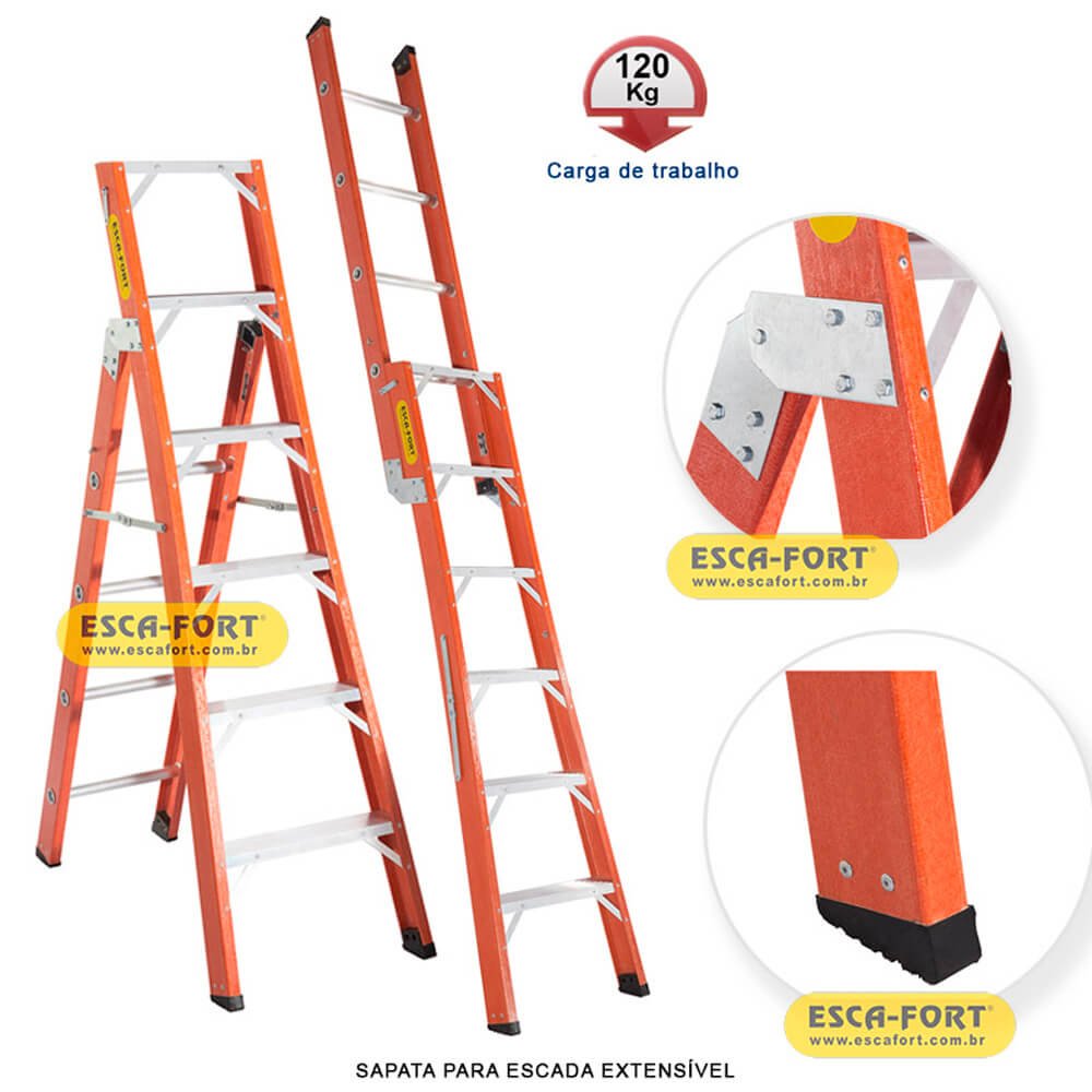 Além de conter sapatas de borracha antiderrapante ela é uma escada leve, durável, altamente resistente, não conduz eletricidade, não enferruja e conta com um sistema seguro de travamento e articulação;