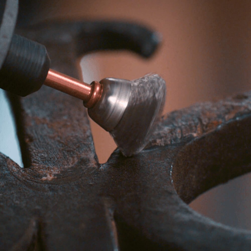 As escovas de aço inoxidável não causam "pós-oxidação" quando usadas em materiais resistentes à corrosão, como estanho, alumínio e aço inoxidável. Ideal para limpeza, remoção de rebarbas e acabamento de superfícies. Muito eficaz em superfícies planas e locais de difícil acesso, como entalhes. O conjunto inclui dois acessórios para escova de aço inoxidável.