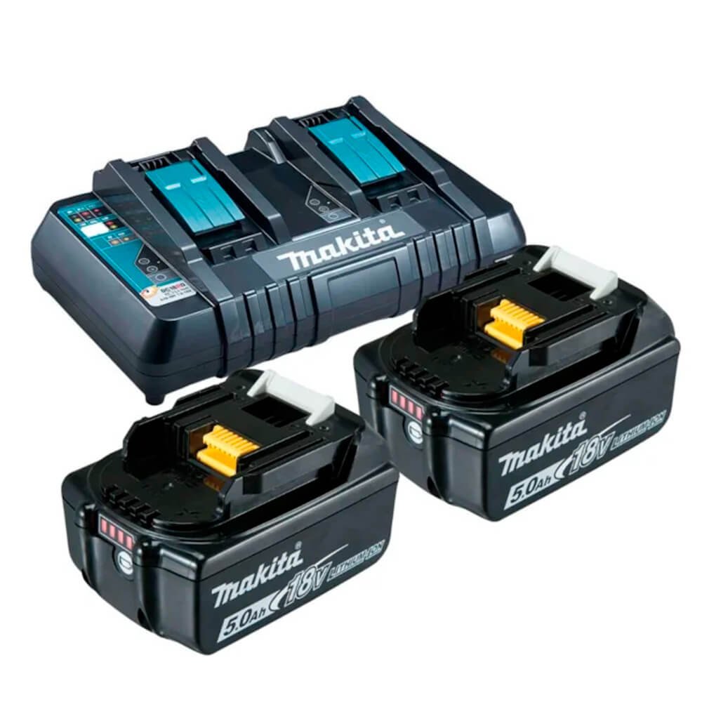 2 baterias 18V 5,0 Ah, carregador duplo rápido, punho lateral e maleta.