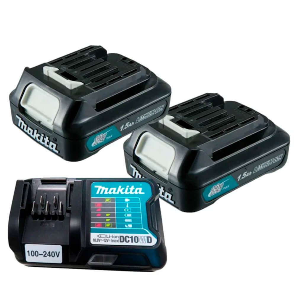 2 baterias 12V 1,5 Ah, carregador simples e maleta.