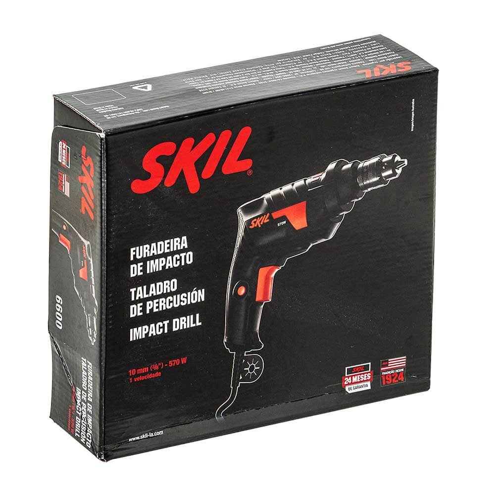 A Furadeira de Impacto Skil 6600 possui 570 Watts de potência, é super leve e compacta! O Mandril metálico de 3/8" (10 milimetros) é robusto para as aplicações diarias. Com o botão comutador para perfurações com ou sem impacto é possível realiza perfurações em distintos materiais tais como: alvenaria, concreto, madeira, metal, com o botão trava é possivel realizar trabalhos contínuos.