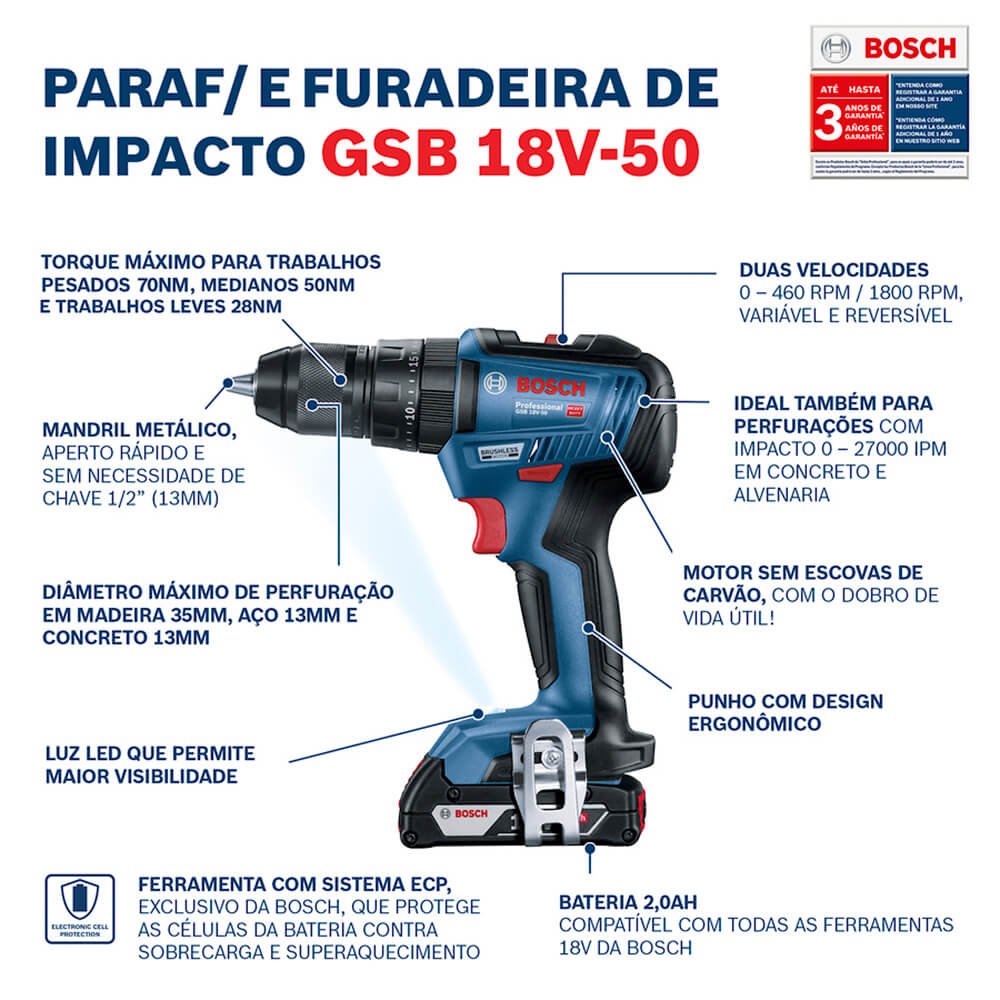 Furadeira/ Parafusadeira de Impacto à Bateria 18V GSB 18V-50 - Bosch