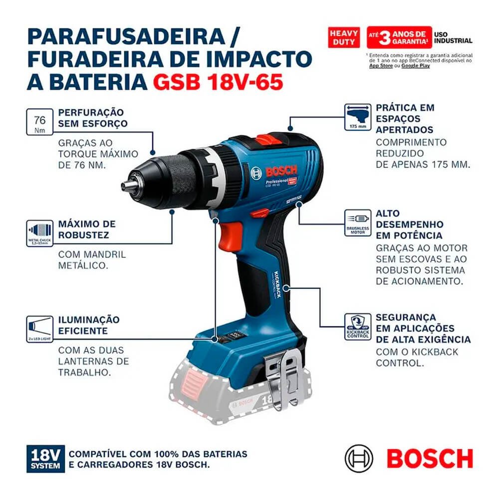 Furadeira/ Parafusadeira de Impacto à Bateria GSB 18V-65 1/2" 18V - Bosch