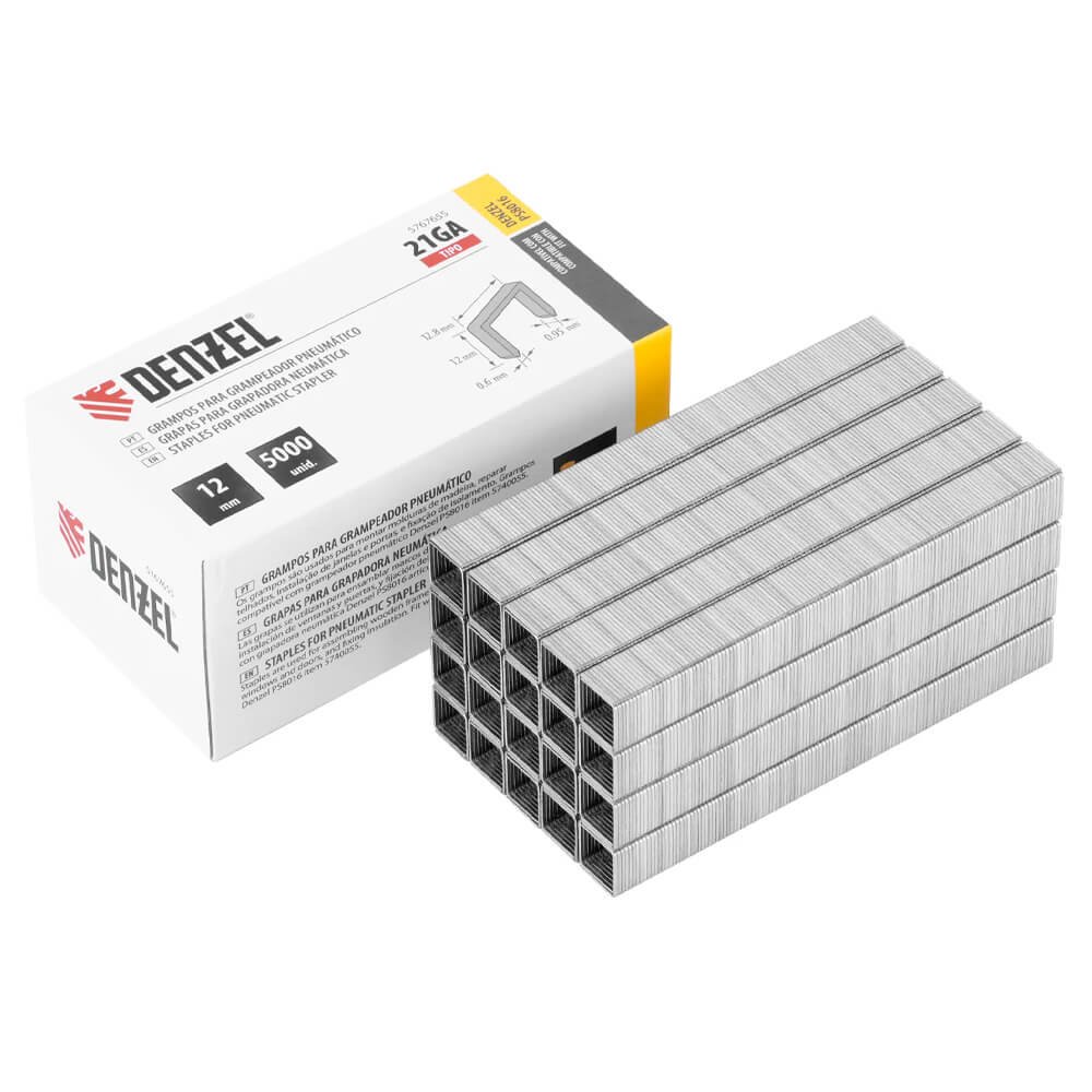 Grampos 21GA Denzel 5767655 com largura de 12,8 mm, 5000 peças por pacote, destinados a grampeadores pneumáticos compatíveis com fixadores de tamanho 12 x 0,95 x 0,6 mm. Eles são usados para fixar materiais laminados em uma base de madeira, adequados para estofamento de móveis, instalação de pisos e fixação de isolamento.