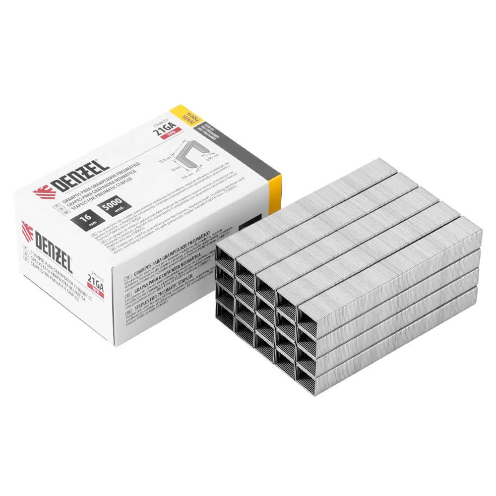 Grampos 21GA Denzel 5768055 com largura de 12,8 mm, 5000 unidades por pacote, são destinados a grampeadores pneumáticos compatíveis com fixadores de tamanho 16 x 0,95 x 0,6 mm. Eles são usados para fixar materiais laminados em uma base de madeira e são adequados para estofamento de móveis, instalação de pisos e fixação de isolamento.