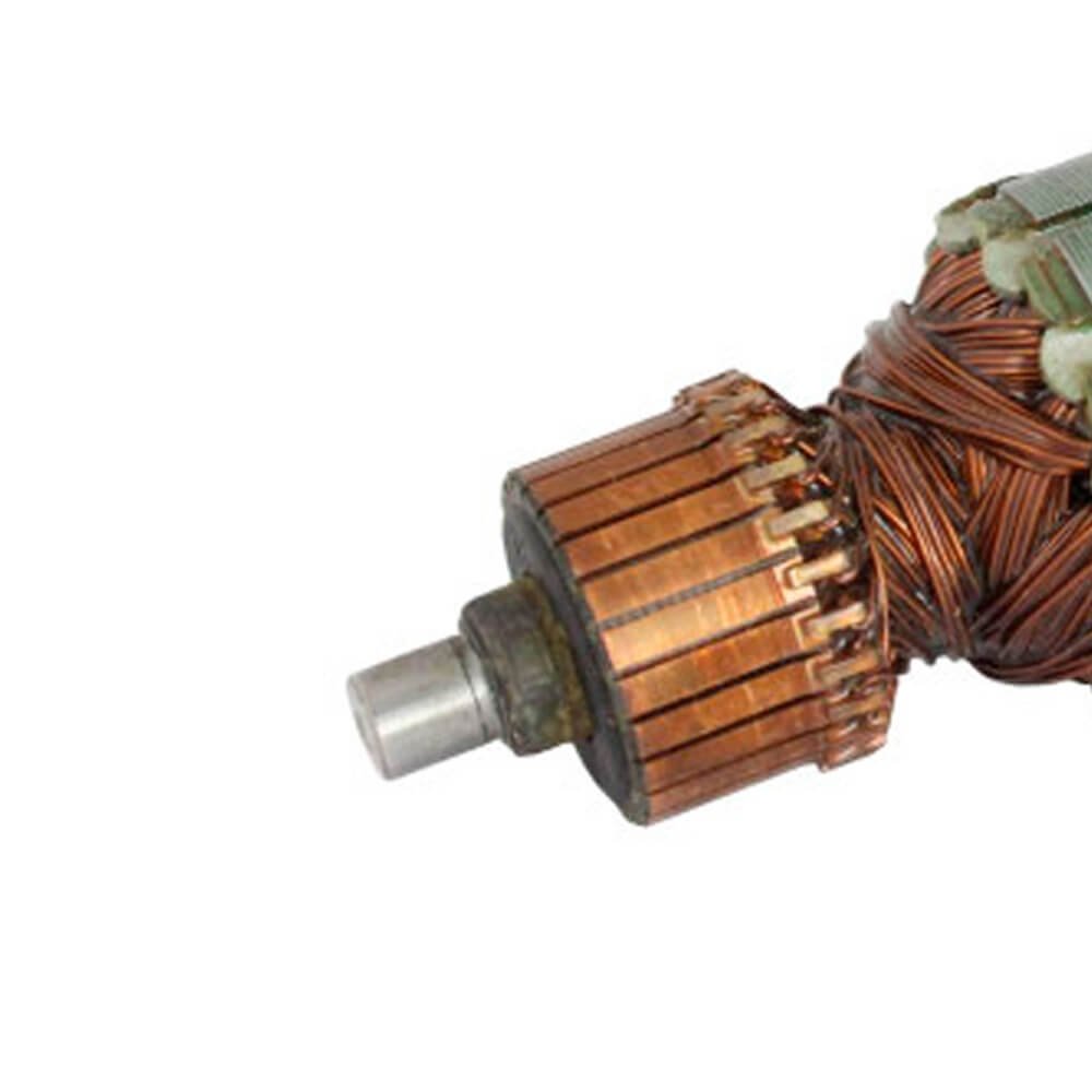 Induzido também conhecido como rotor, usado em conjunto com o estator ou bobina de campo, rolamentos e escovas de carvão.