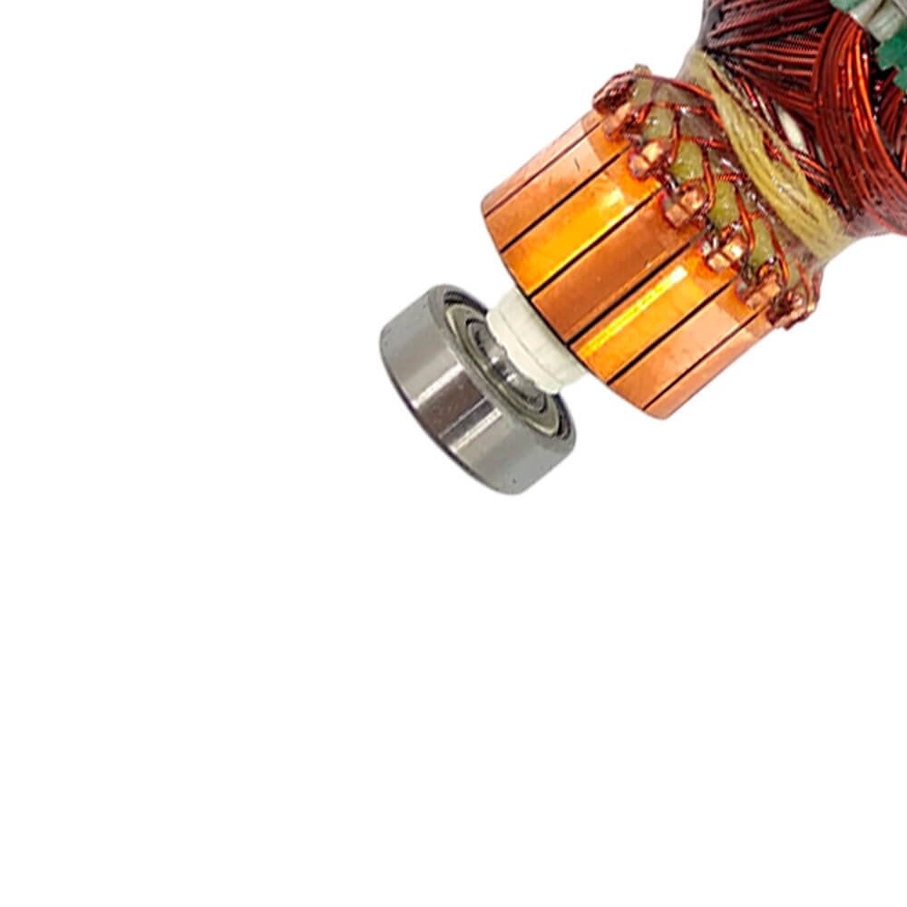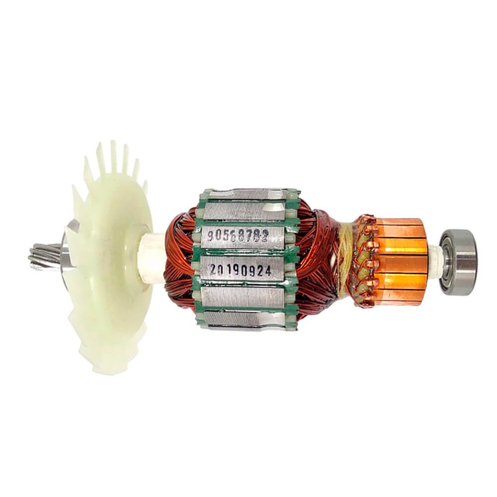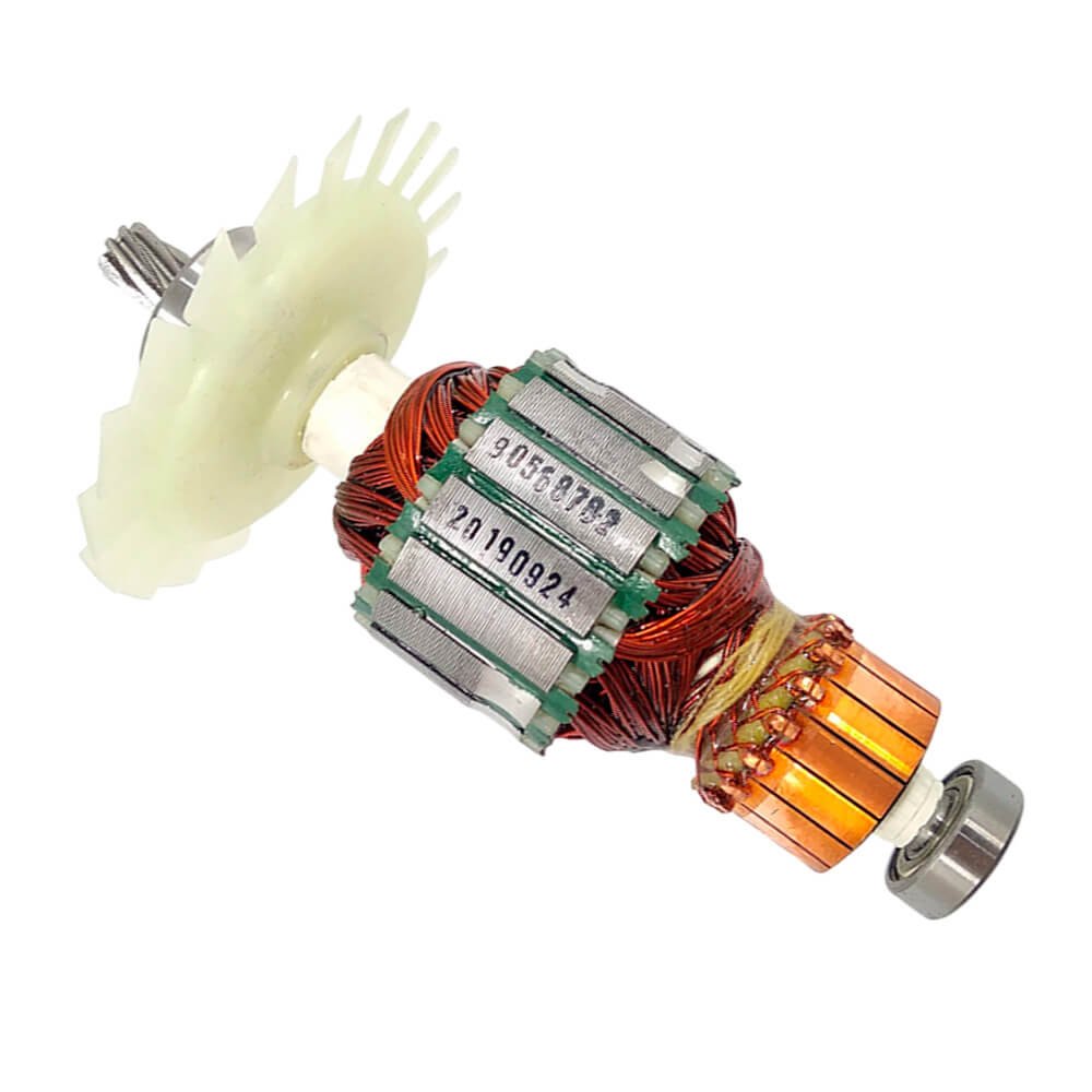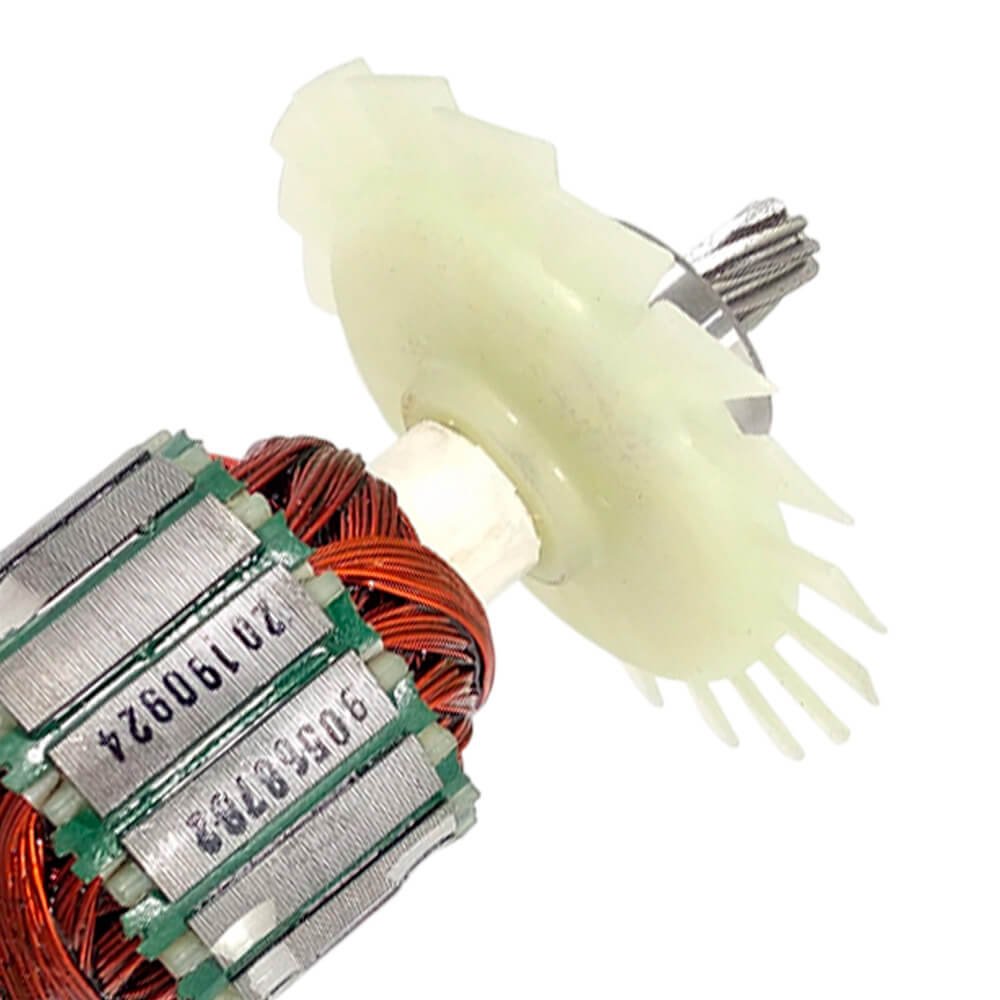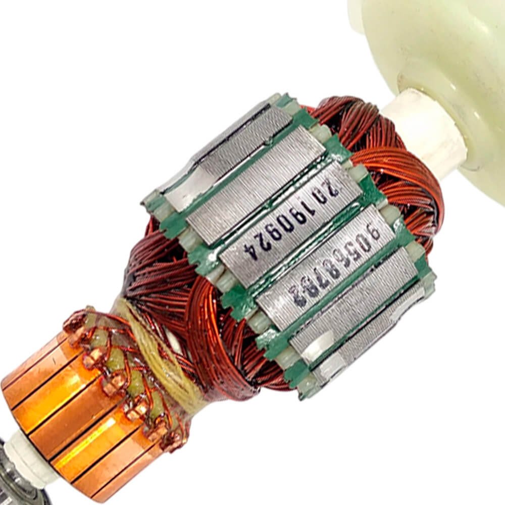 Induzido também conhecido como rotor, usado em conjunto com o estator ou bobina de campo, rolamentos e escovas de carvão.