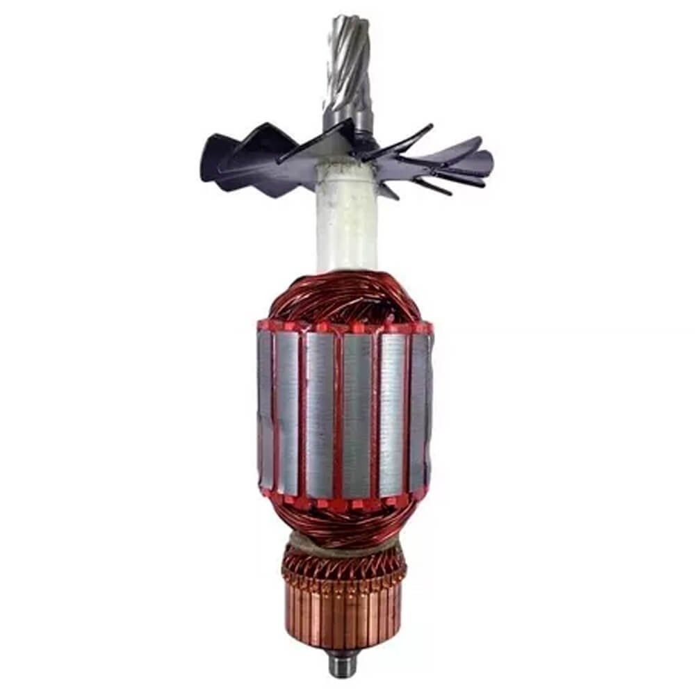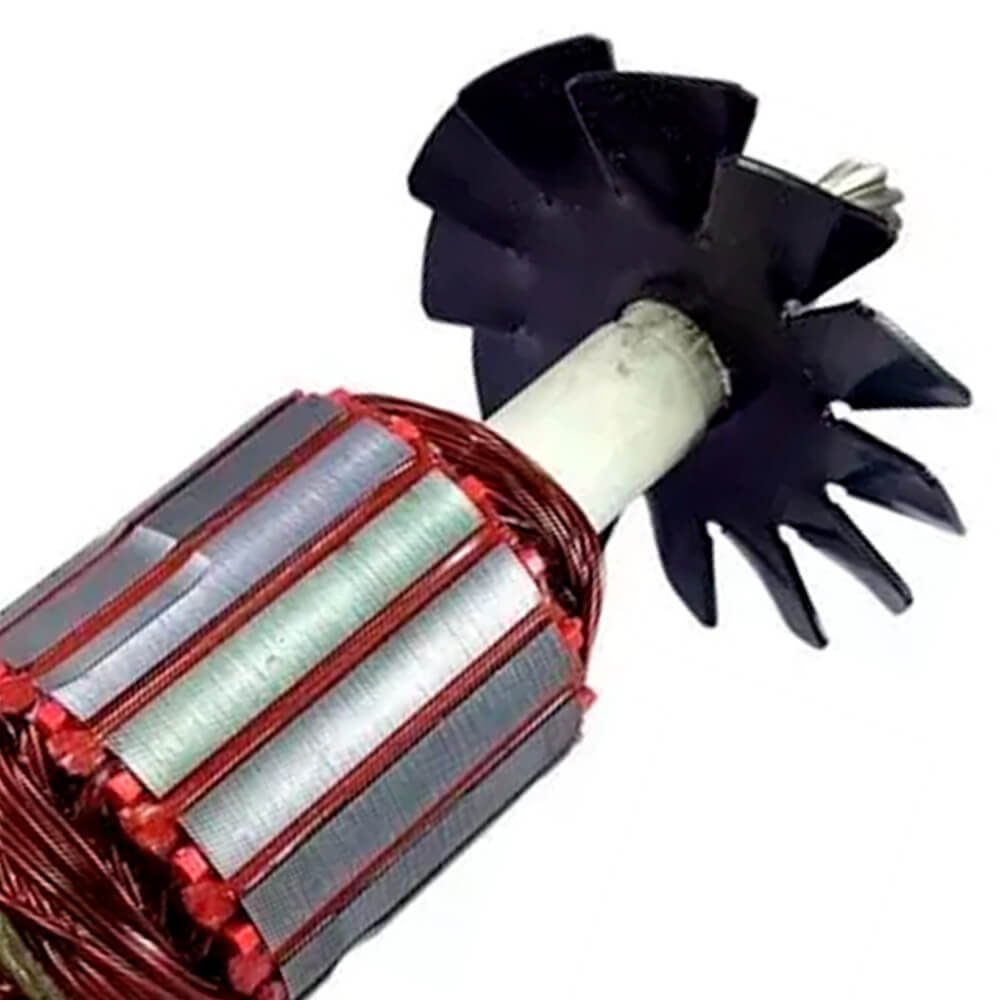 Induzido também conhecido como rotor, usado em conjunto com o estator ou bobina de campo, rolamentos e escovas de carvão.