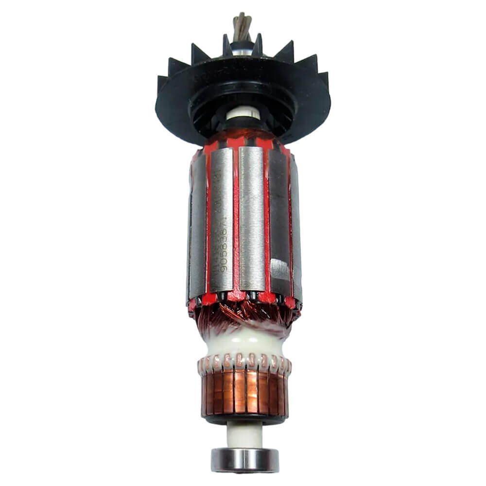 Induzido também conhecido como rotor, usado em conjunto com o estator ou bobina de campo, rolamentos e escovas de carvão.