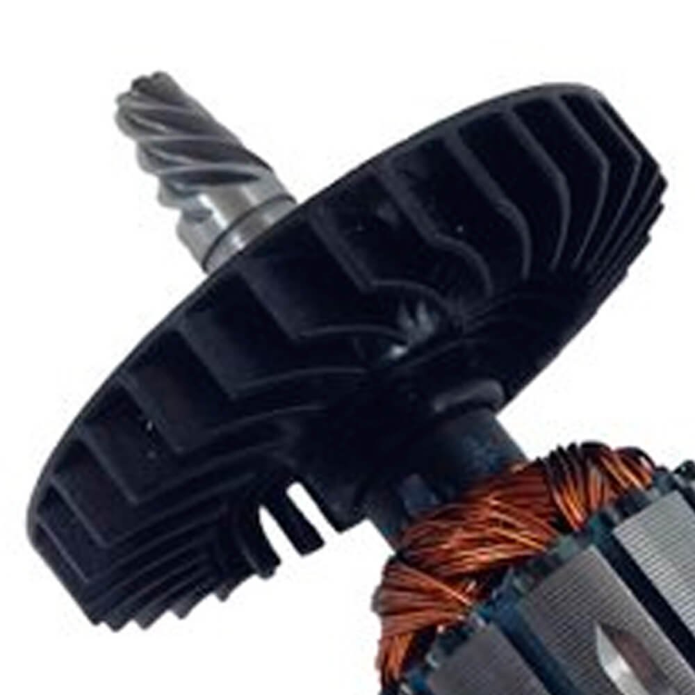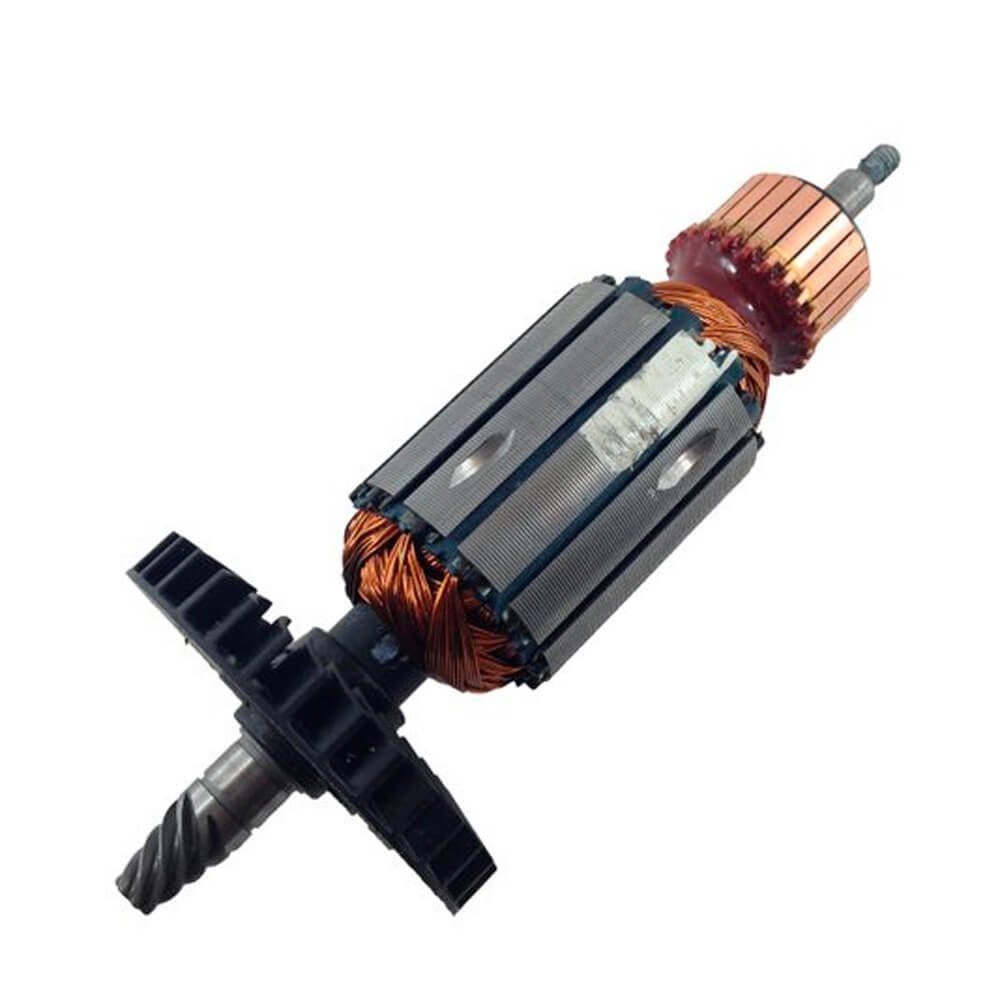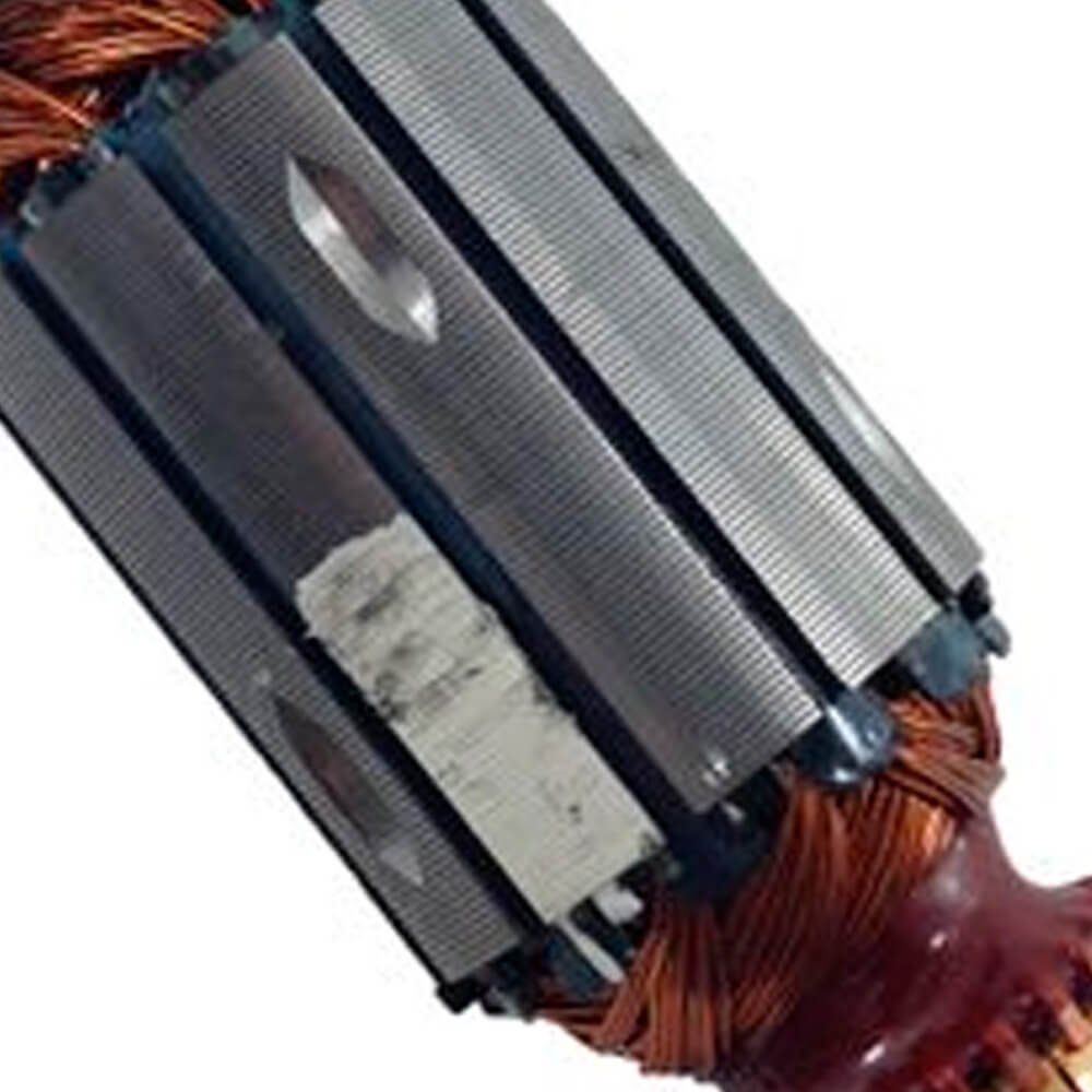 Induzido também conhecido como rotor, usado em conjunto com o estator ou bobina de campo, rolamentos e escovas de carvão.