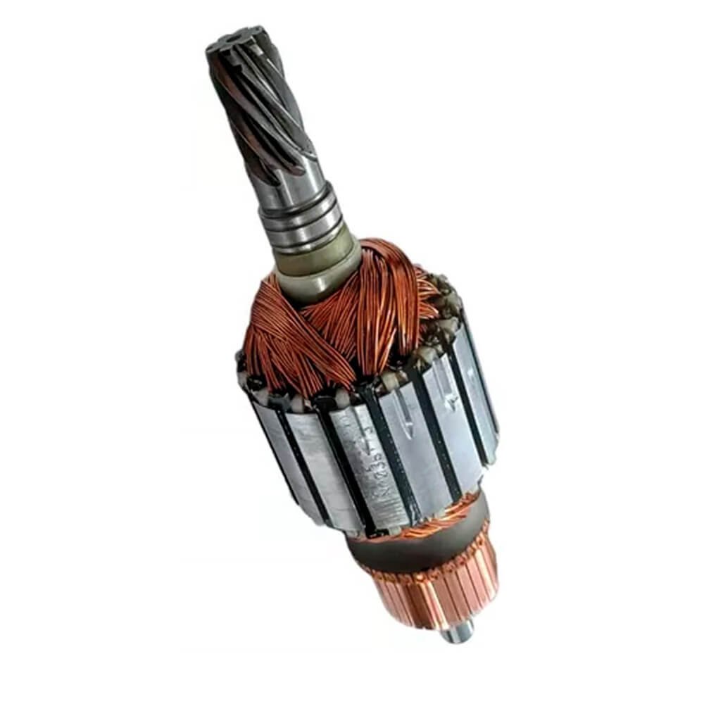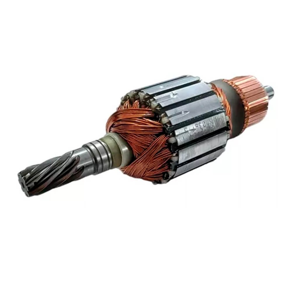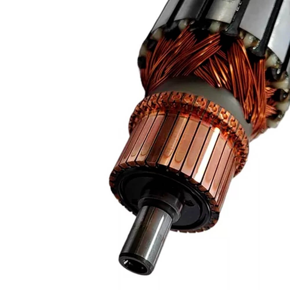 Induzido também conhecido como rotor, usado em conjunto com o estator ou bobina de campo, rolamentos e escovas de carvão.