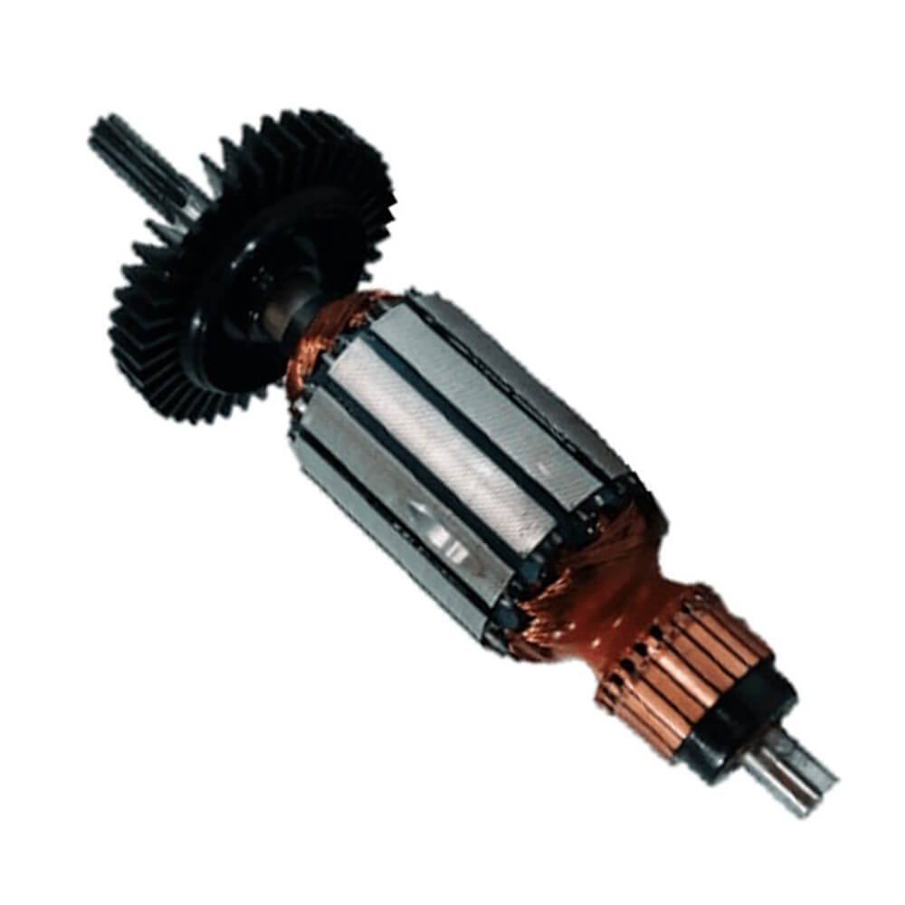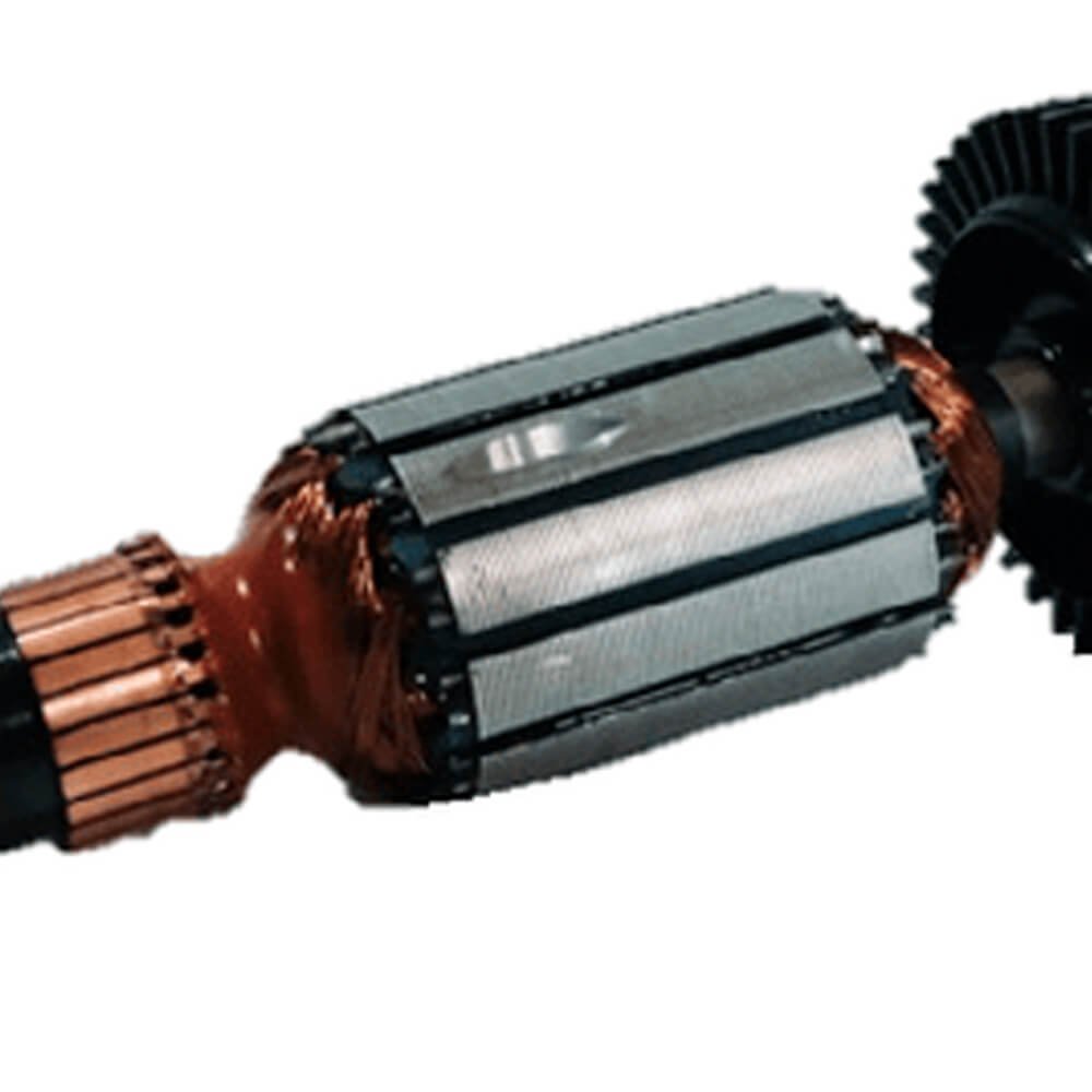 Induzido também conhecido como rotor, usado em conjunto com o estator ou bobina de campo, rolamentos e escovas de carvão.