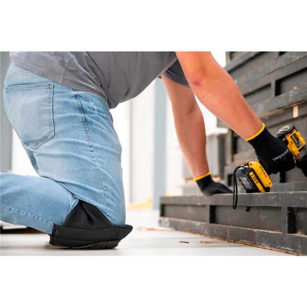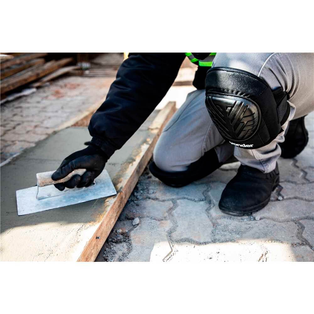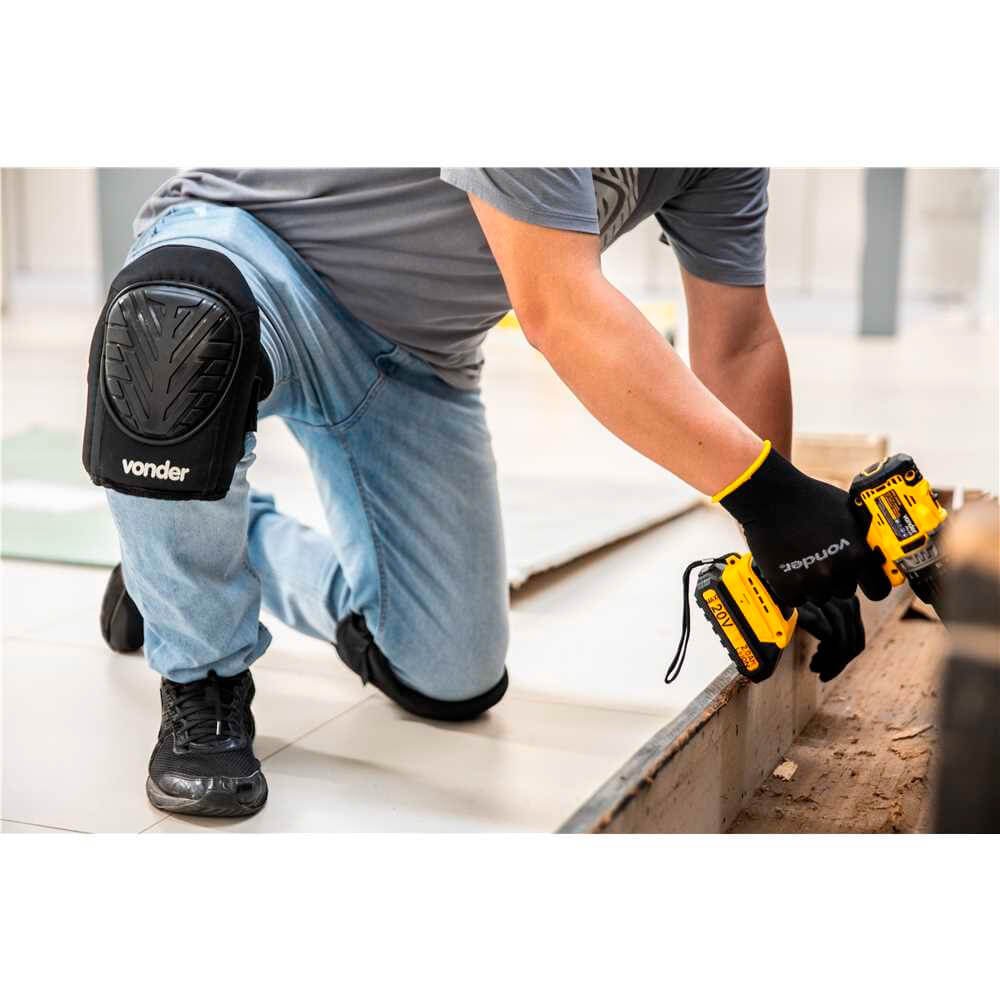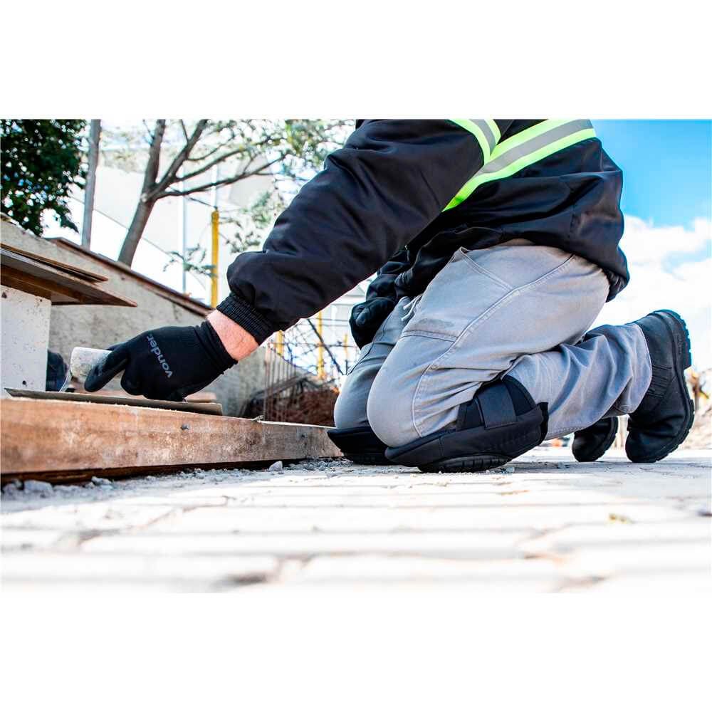 Fabricada em tecido, com proteção em material plástico na mesma cor do tecido e fixado através de duas tiras elásticas com sistema fixa fácil macio. Parte interna com gel, oferecendo maior proteção ao usuário e permitindo maior tempo dos trabalhos em qualquer tipo de solo. Indicada para trabalhos gerais de construção civil.