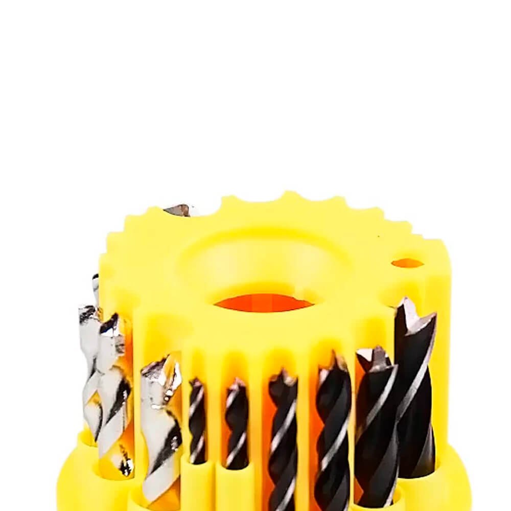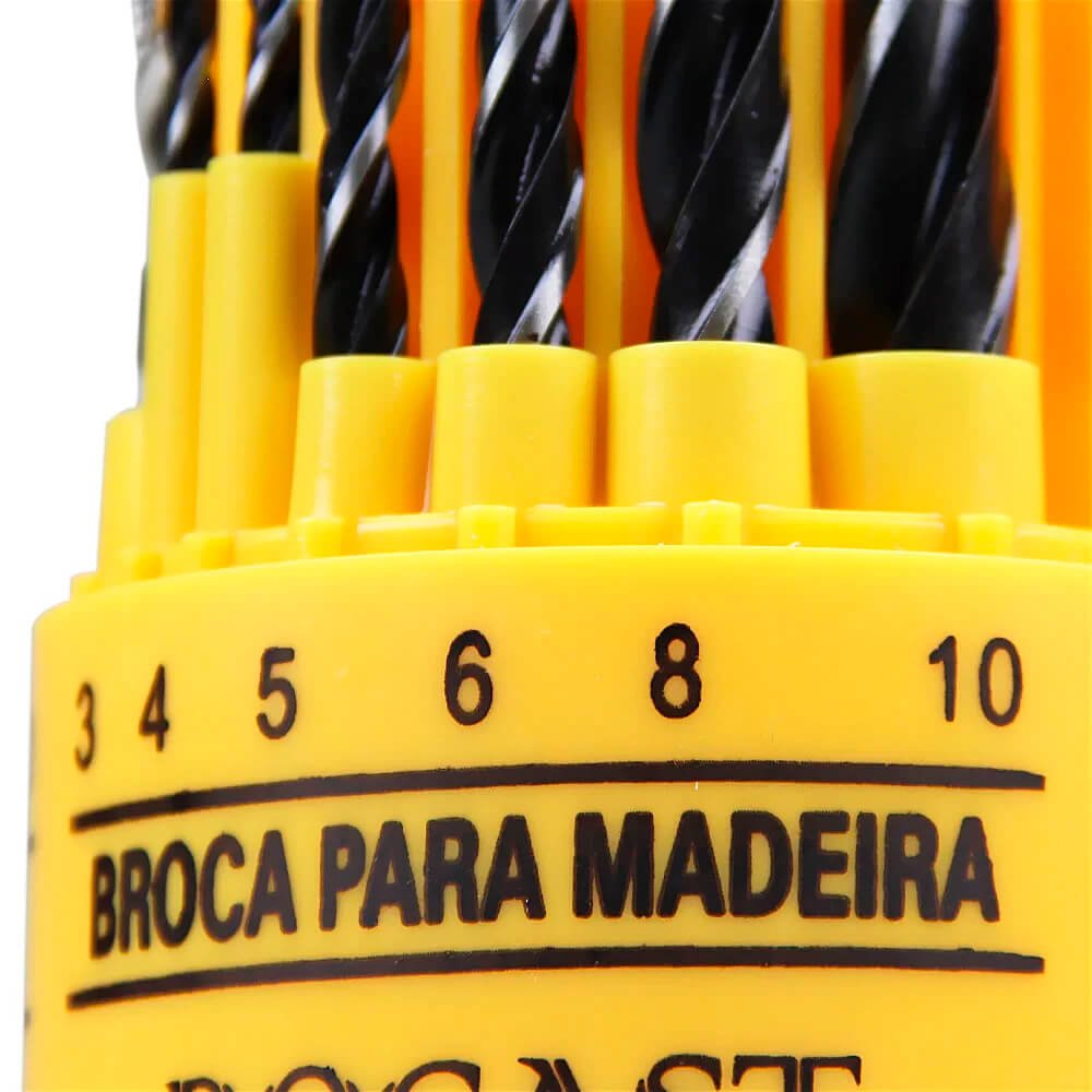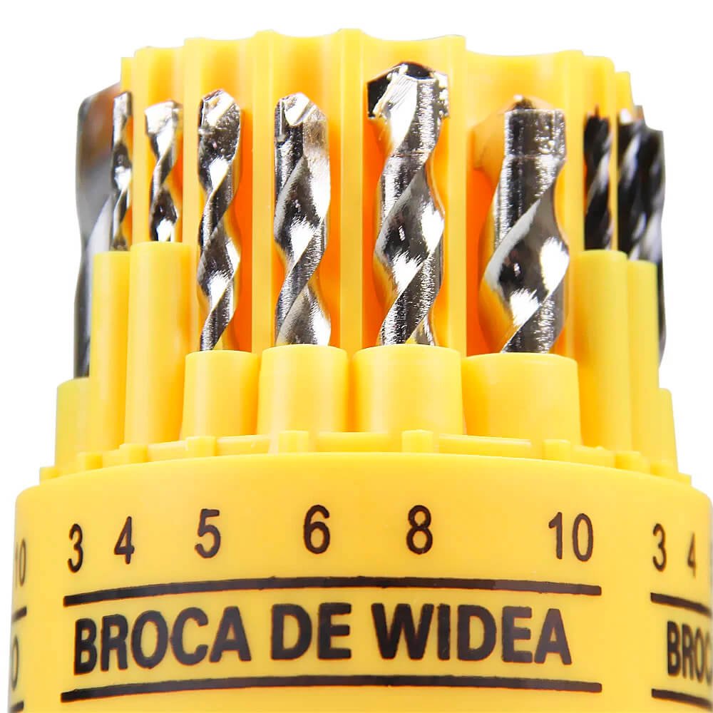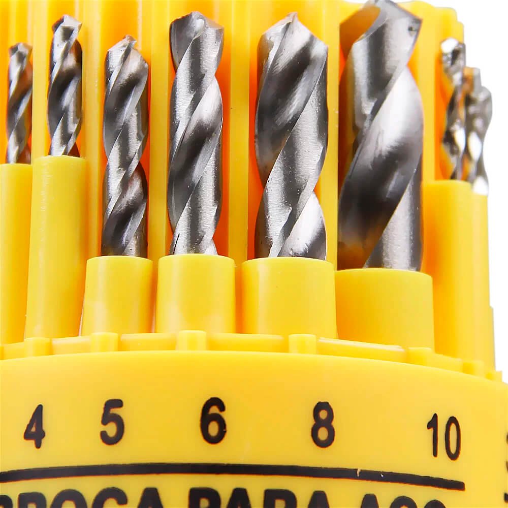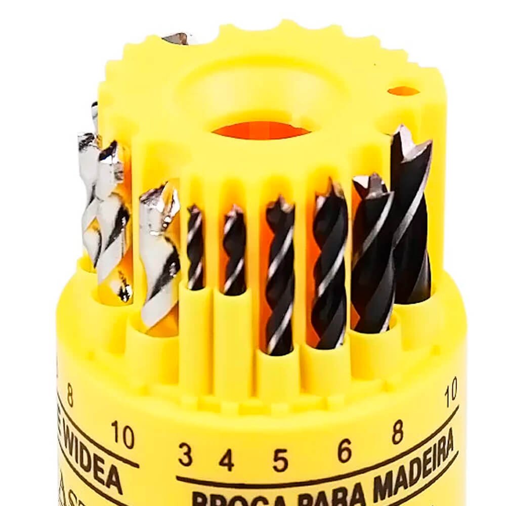 Jogo de brocas combinado fabricadas em aço de ótima resistência, perfeito para sempre ter em mãos a broca certa para perfurar diversos tipos de material como madeira, concreto e metal.
