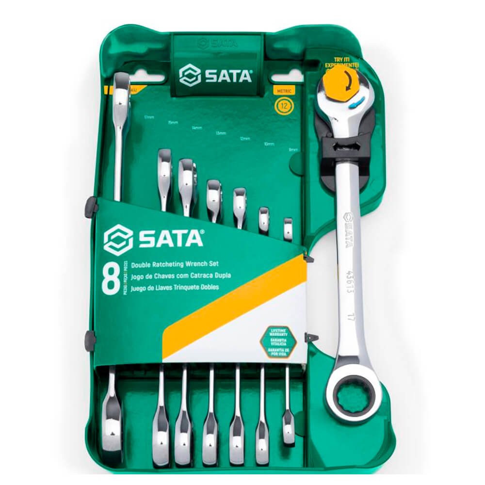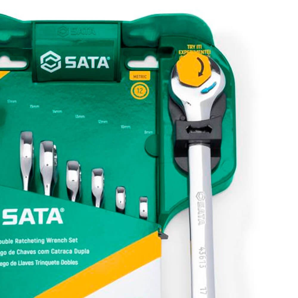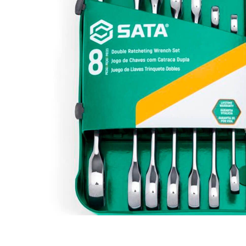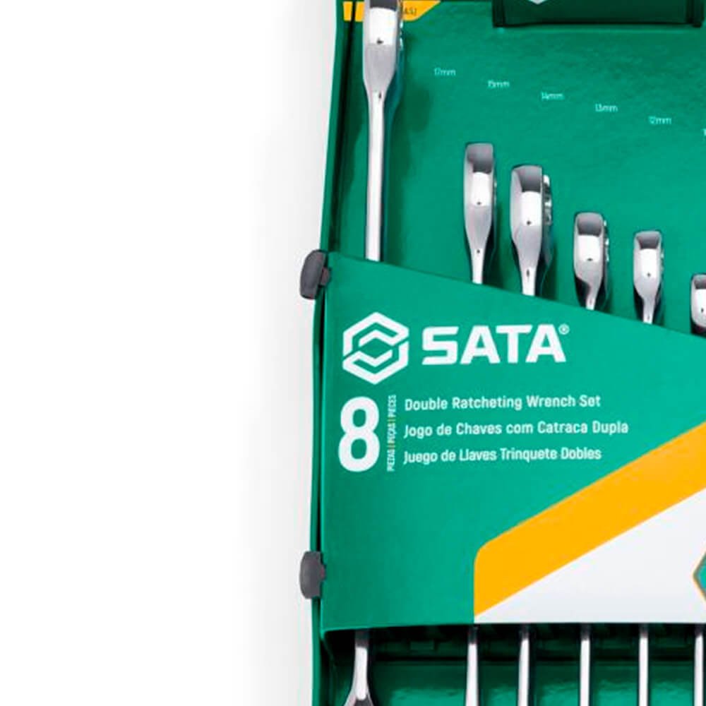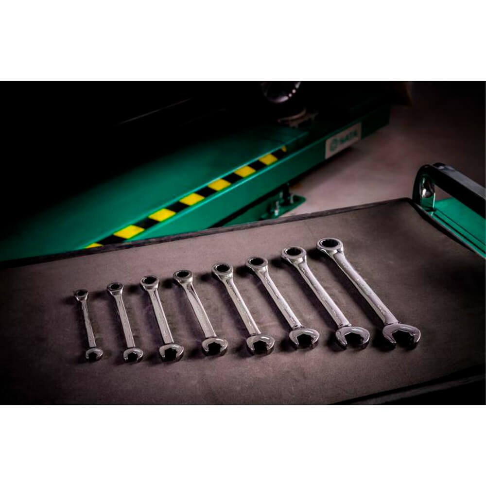 - Jogo Chave Combinada Speedy Catraca de 8 a 19mm com 8 peças SATA com tecnologia de 72 dentes para arco de aperto de 5° para apertos mais precisos contra 30° na chave estrela comum.