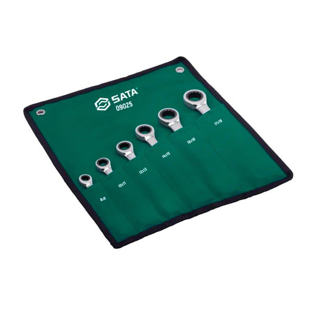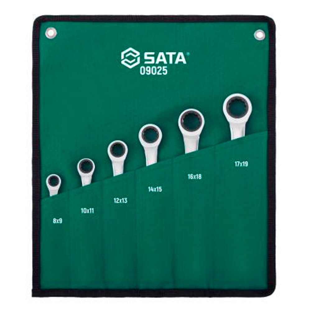 Jogo De Chave Estrela Com Catraca de 8x9-17x19mm com 6 peças SATA com medidas diferentes em cada boca, possuí 72 posições proporcionando um arco de giro de apenas 5° ideal para espaços de dificil alcance ou apertados além de qualidade profissional superior.Este jogo possuí tecnologia surface drive, para abraçar o parafuso ou a porca com mais segurança e facilitar pra você apertar ou desapertar eles sem muito esforço, mesmo em situações complicadas de dificil acesso. Seu corpo longo e medidas diferentes em cada extremidade é ideal para apertos finais e desapertos iniciais, possibilitando torques superiores e mais seguros, acompanha estojo organizador facilita o transporte, armazenamento prático e portátil.