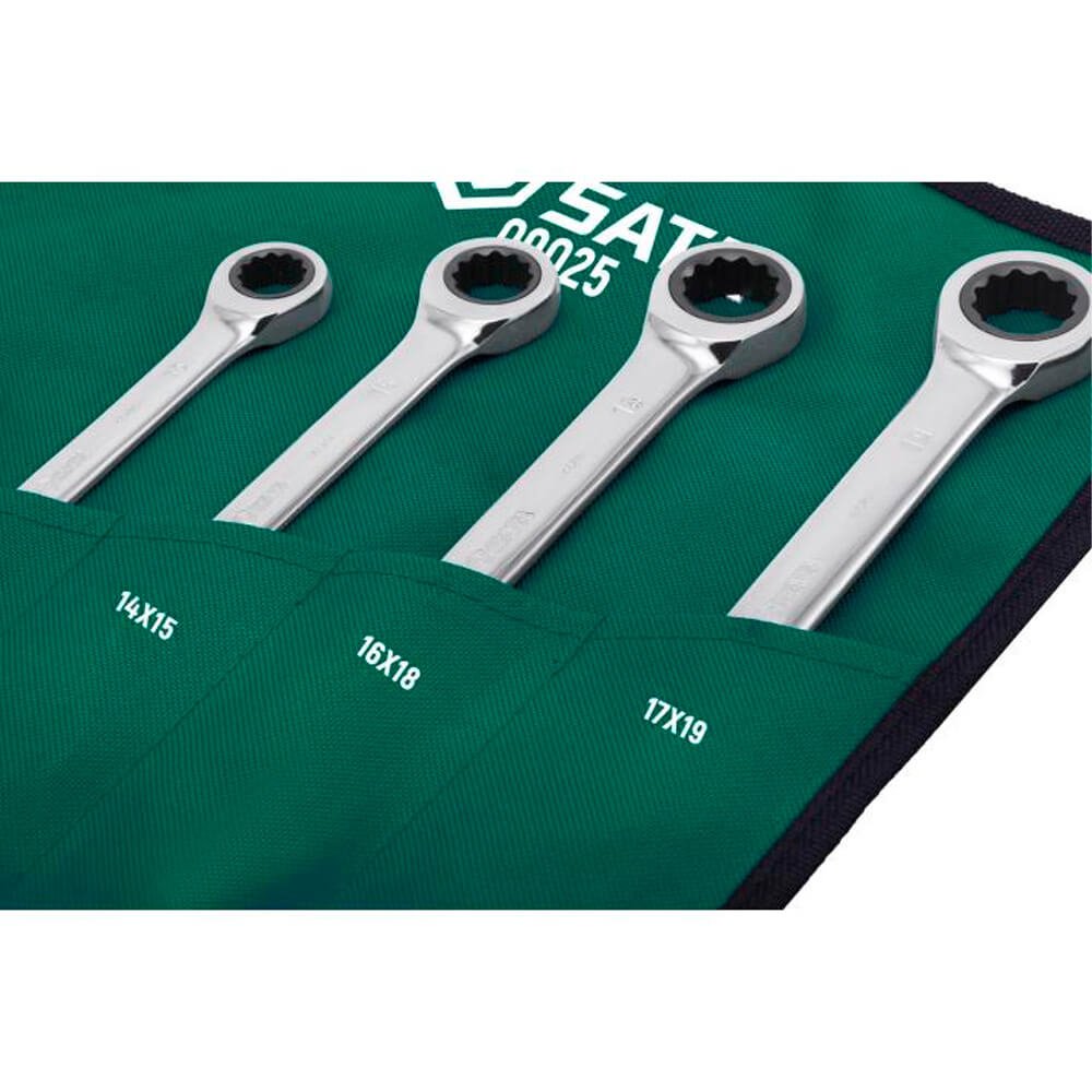 Jogo De Chave Estrela Com Catraca de 8x9-17x19mm com 6 peças SATA com medidas diferentes em cada boca, possuí 72 posições proporcionando um arco de giro de apenas 5° ideal para espaços de dificil alcance ou apertados além de qualidade profissional superior. Este jogo possuí tecnologia surface drive, para abraçar o parafuso ou a porca com mais segurança e facilitar pra você apertar ou desapertar eles sem muito esforço, mesmo em situações complicadas de dificil acesso. Seu corpo longo e medidas diferentes em cada extremidade é ideal para apertos finais e desapertos iniciais, possibilitando torques superiores e mais seguros, acompanha estojo organizador facilita o transporte, armazenamento prático e portátil.