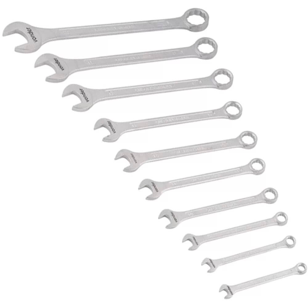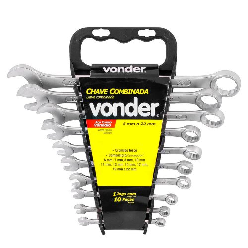 1 Jogo de chaves combinadas, composto por um suporte plástico com 10 peças, sendo: 6 mm, 7 mm, 8 mm, 10 mm, 11 mm, 13 mm, 14 mm, 17 mm, 19 mm e 22 mm.
