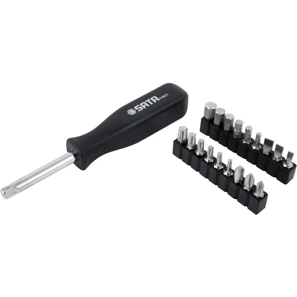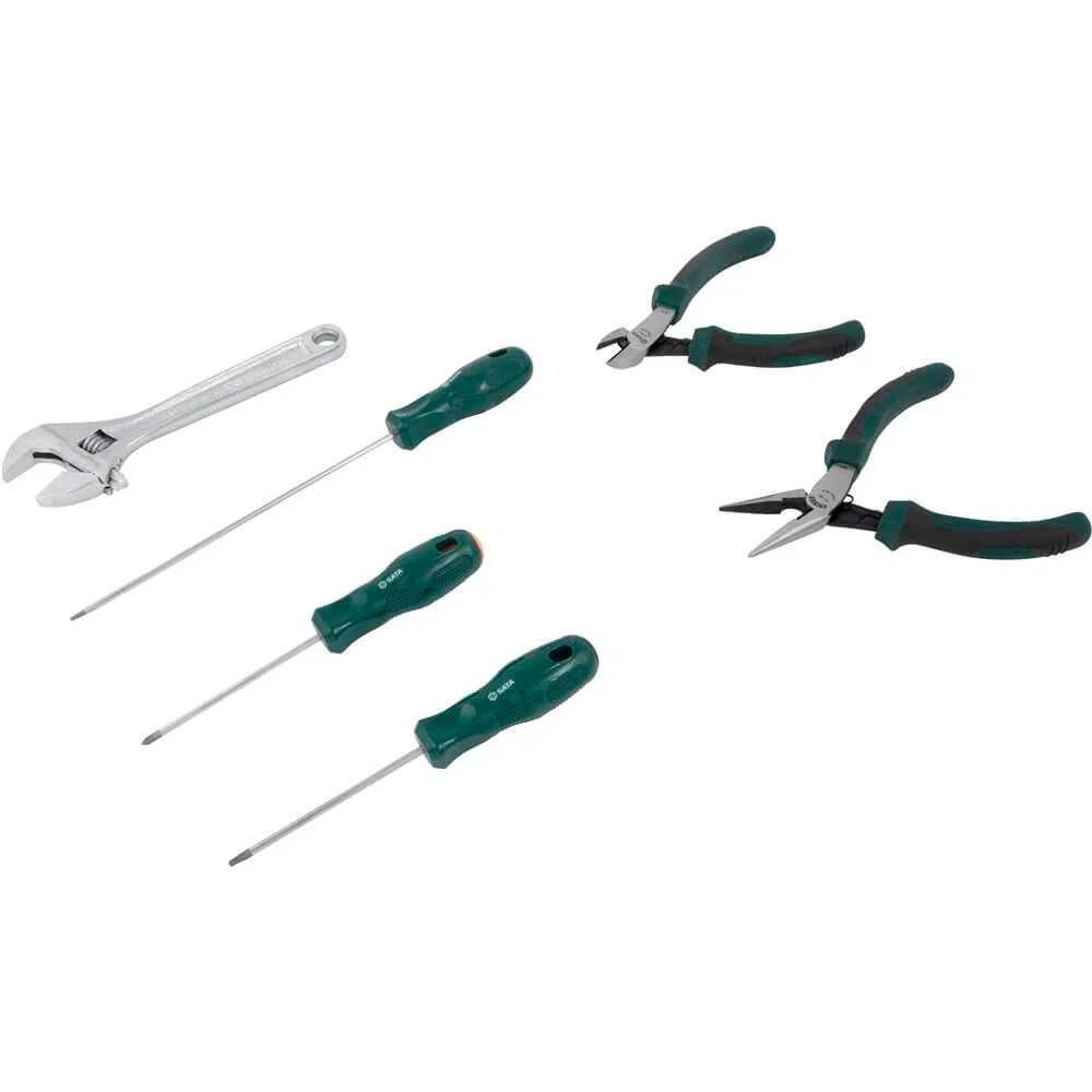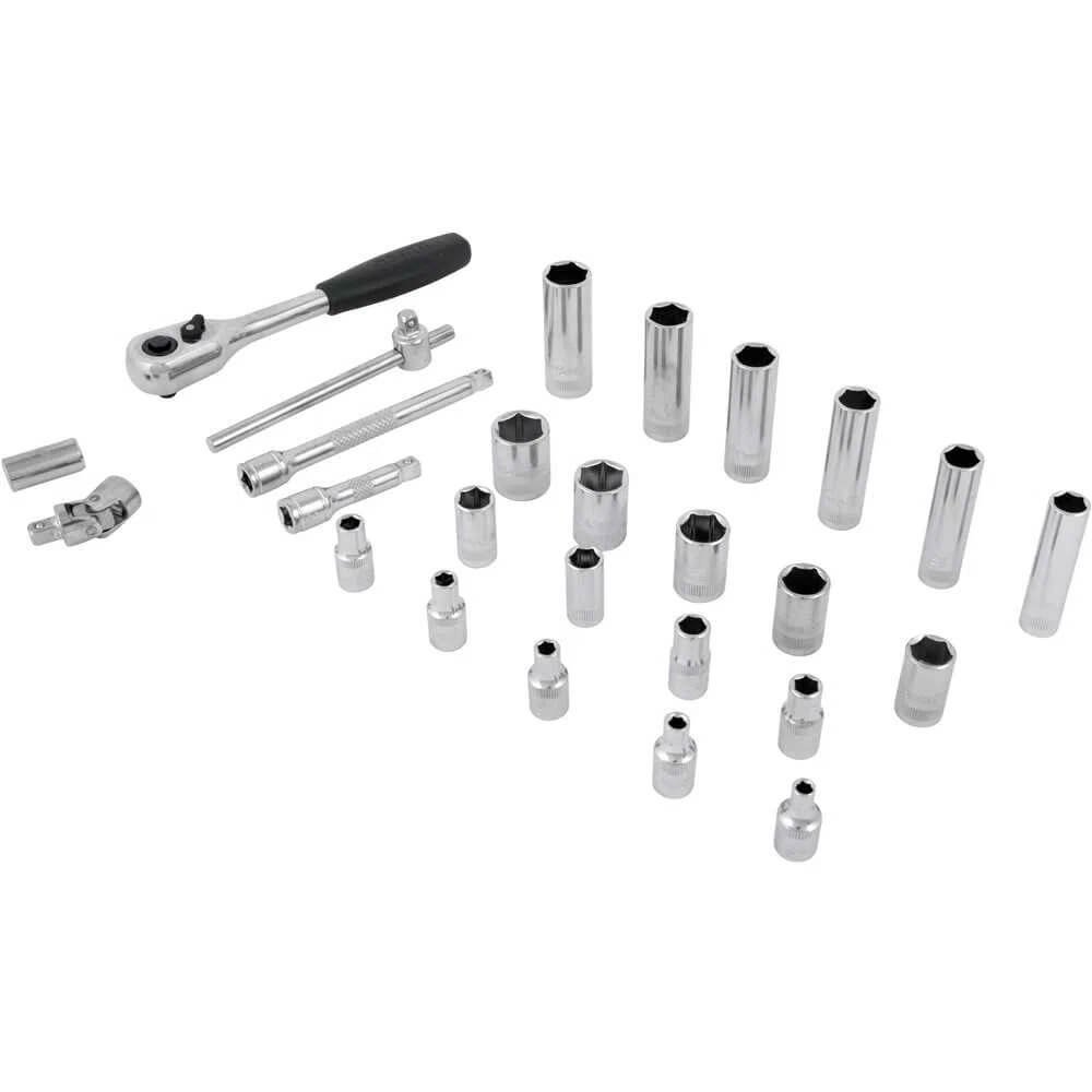 Este Jogo é composto por: 20 Soquetes 1/4”: 14 Curtos: 3,5 - 14mm | 6 Longos: 8 - 13mm 5 Acessórios para Soquetes 1/4”: Catraca | Cabo T | Junta-Universal | 2 extensões 18 pontas bits: Phillips #1, 2, 3 | Torx: T-10 - 40 | Hex: 3 - 8mm | Fenda: 4, 5.5, 6.5mm 1 Cabo para Pontas | 1 Adaptador para Pontas-Cabo 3 Chaves Retas: #0x75mm | Fenda: 1/8”x150mm | Torx: T8x75mm 3 Alicates: Meia-Cana 5” | Corte-Diagonal 4” | Pressão: 5” 1 Chave ajustável: 6”