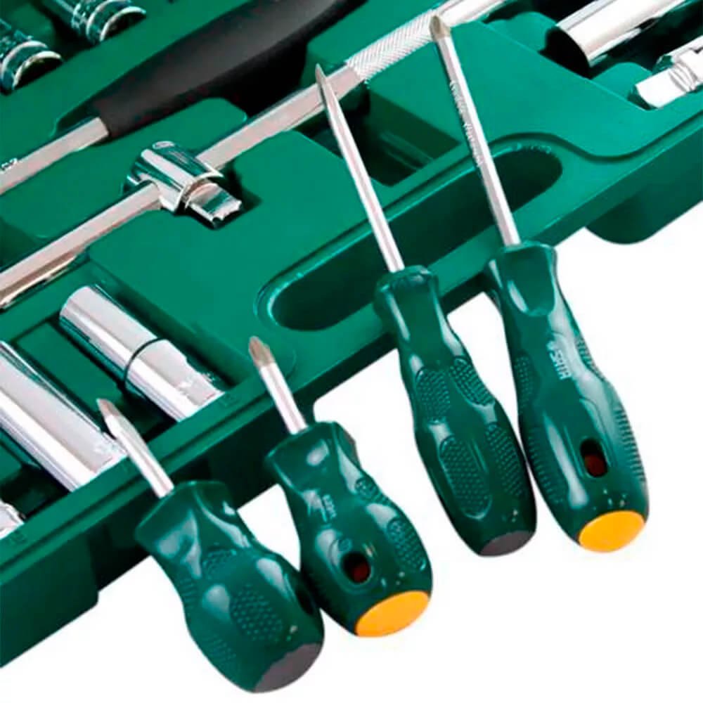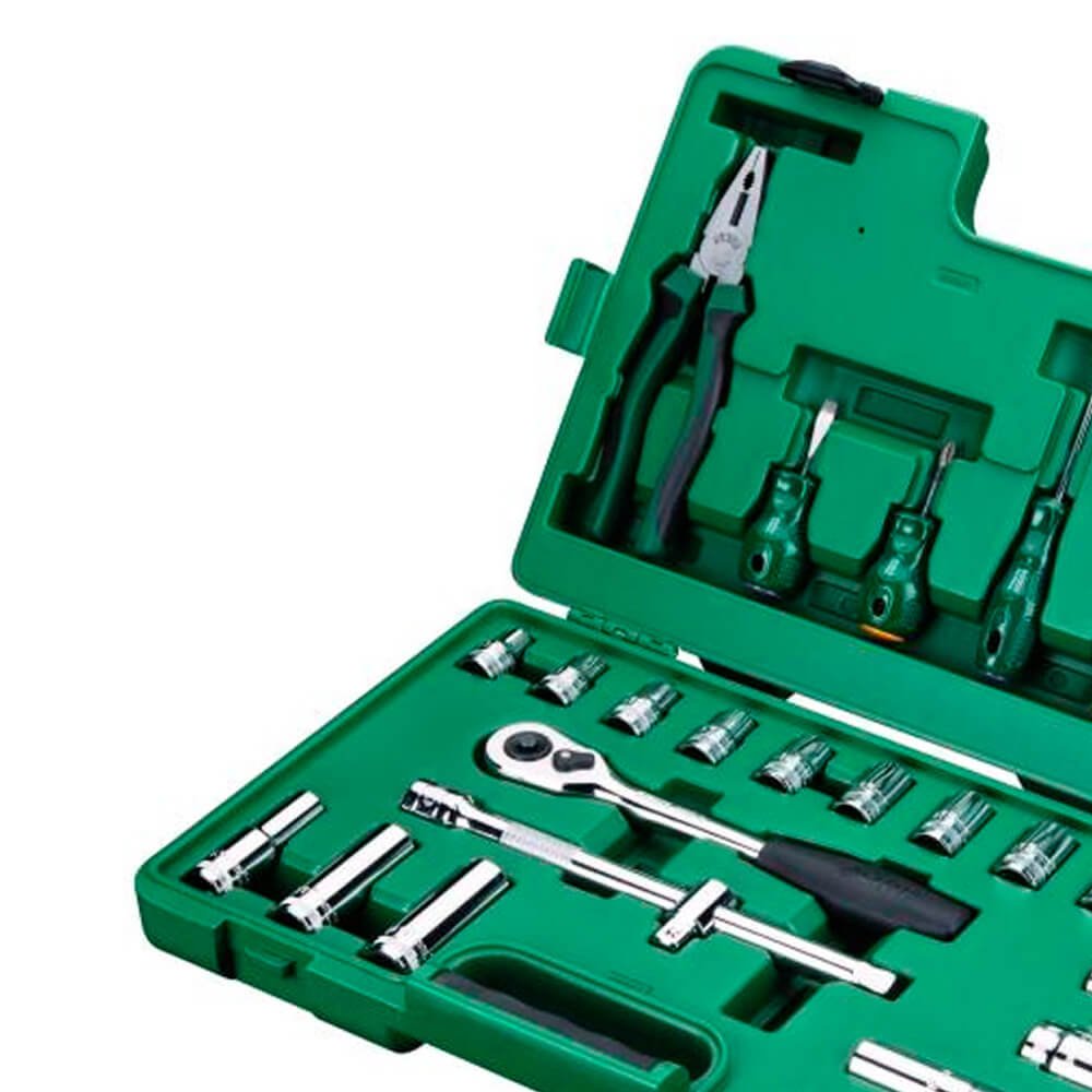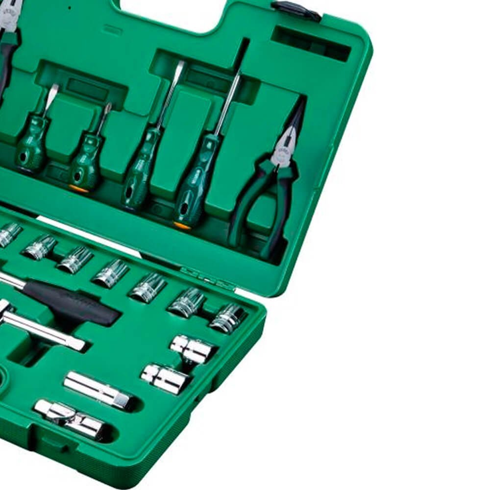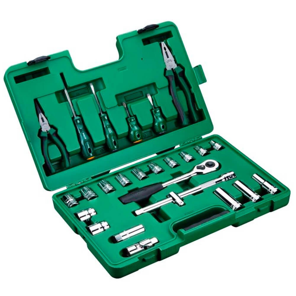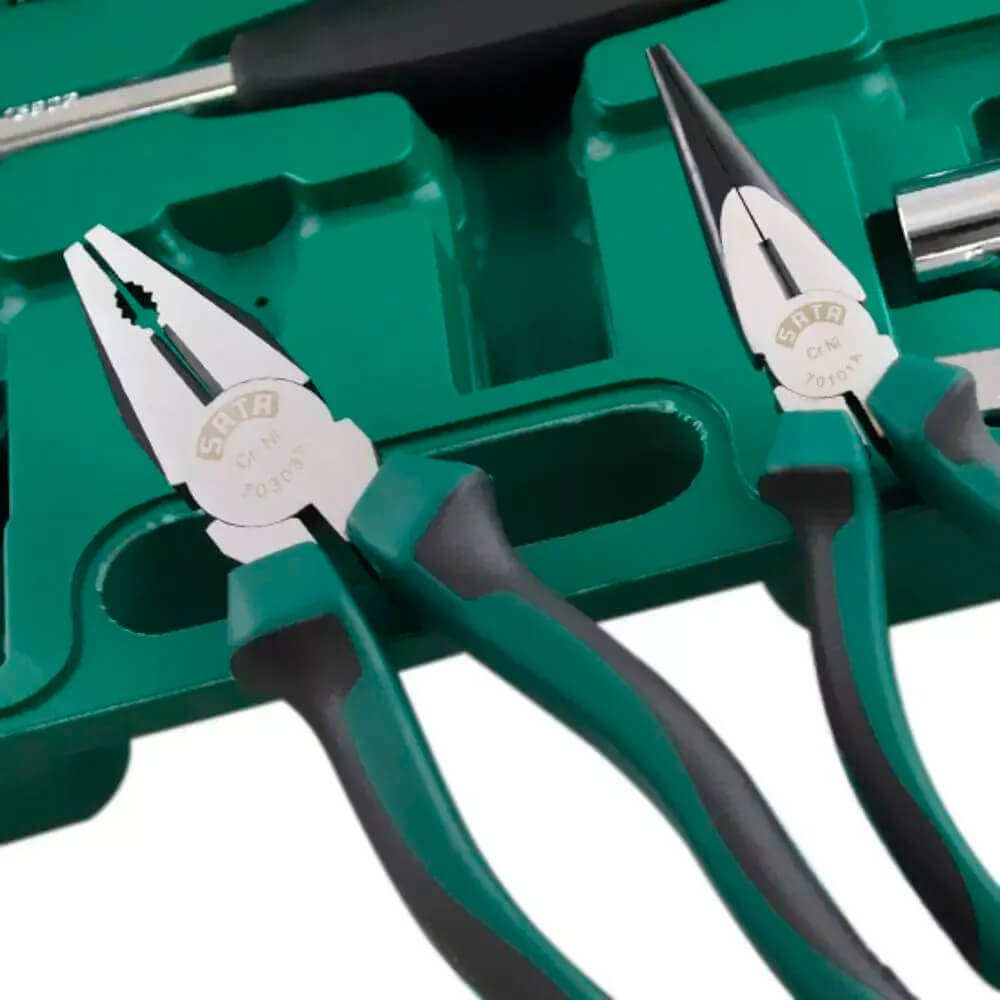 Perfeito para manutenções em geral o Jogo de soquetes e ferramentas com 26 peças da Sata, contém as peças mais utilizadas no dia a dia como: alicate universal, alicate meia cana, chaves fenda e phillips e soquetes sextavados 1/2" de 10 a 24mm além de soquetes para vela, junta universal e adaptador para soquete 3/8" para 1/2".