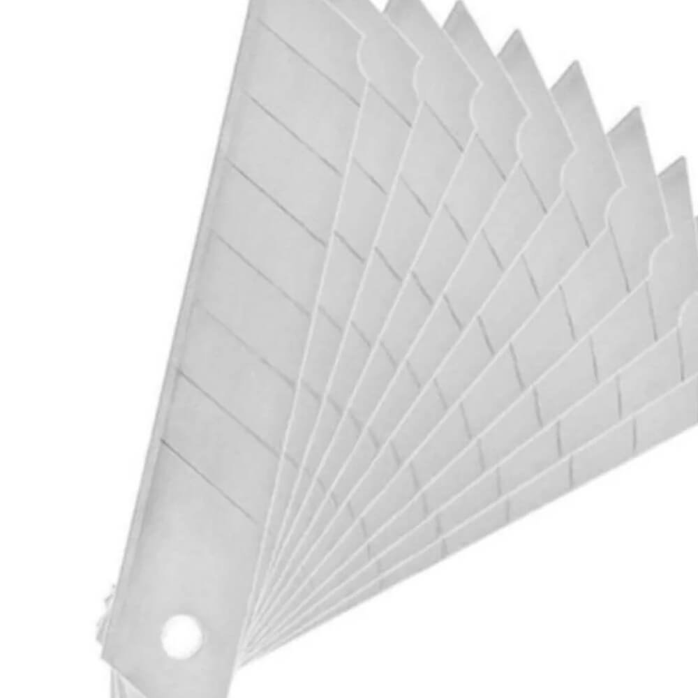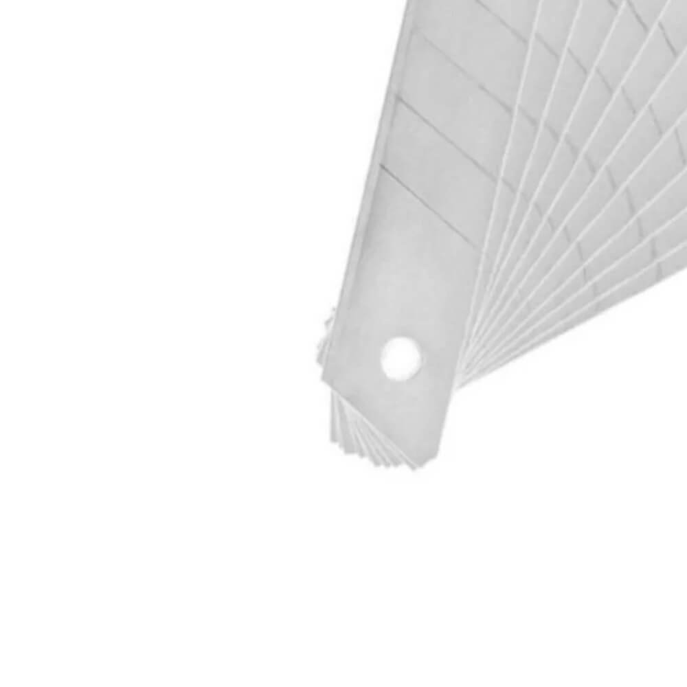 A Lâmina para Estilete fabricada em aço carbono é usada para cortar papel grosso, filme, papelão, cartolina, sulfite, contact, etc. A lâmina possui entalhes ao longo do seu comprimento para ajustar o tamanho conforme o desgaste, facilitando o processo sem dificuldade e não deixando rebarbas.