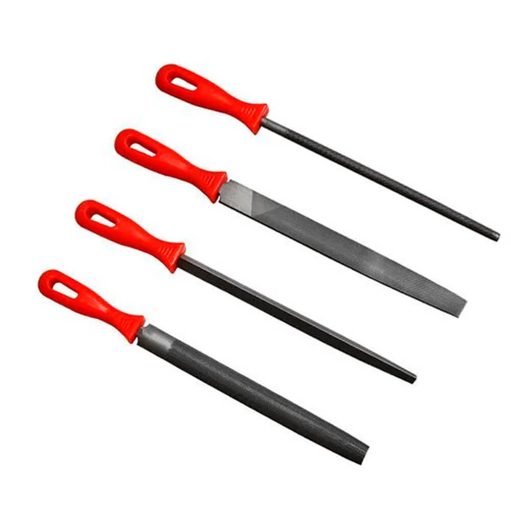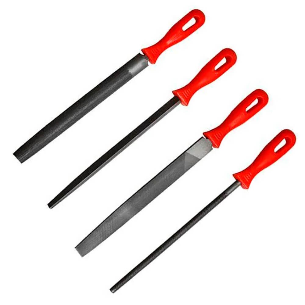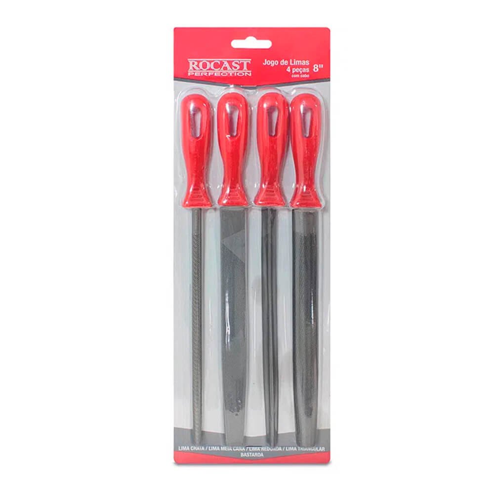 Jogo com 4 limas mecânicas bastardas para o desbaste rápido de materiais ferrosos e não-ferrosos de 20 cm cada. Possui ambas as faces com picado duplo e as bordas com picado simples, a ponta é ligeiramente afilada na largura.