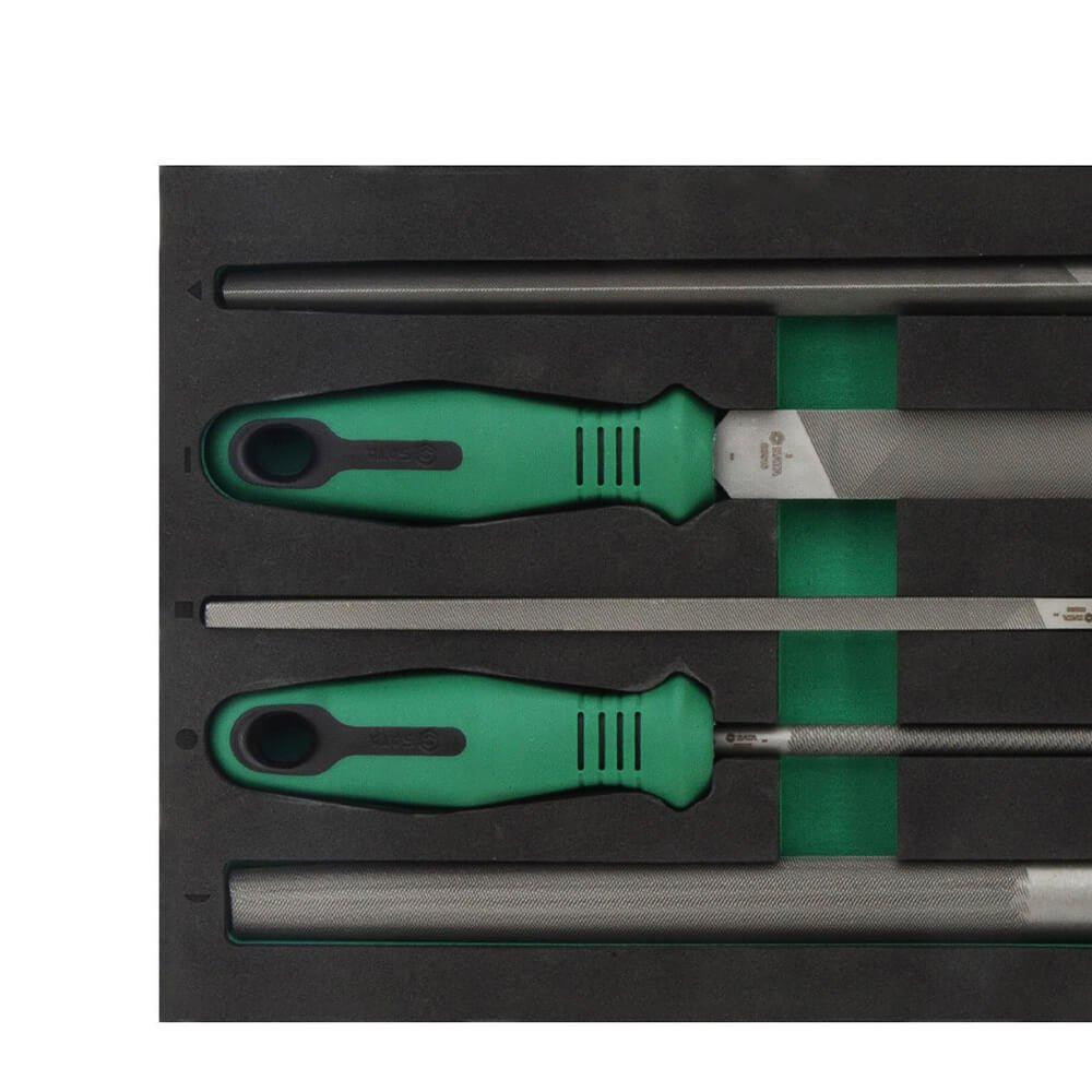 O Jogo de Limas com 8 Peças Em Bandeja EVA Sata é ideal para trabalhos de precisão em metais, plásticos e outros materiais, oferecendo versatilidade e controle em tarefas de moldagem, afiação e acabamento fino. Conta com cabos ergonômicos de material duplo, que proporcionam excelente aderência, maior torque e reduzem a fadiga nas mãos durante o uso prolongado. A construção em aço de alta resistência garante durabilidade, eficiência no desbaste e maior vida útil da ferramenta. Os cabos com furo passante facilitam o armazenamento em painéis ou ganchos. Acompanhado com um berço organizador de EVA SATA, uma solução ideal para maximizar a produtividade e a organização em oficinas automotivas e industriais. Com eles, cada ferramenta se encontra no seu lugar, proporcionando um ambiente de trabalho mais produtivo. Desenvolvidos com um design modular e intercambiável, os berços EVA permitem personalizar as gavetas de acordo com as suas preferências, garantindo flexibilidade para adicionar novos conjuntos e transferi-los entre diferentes carros de ferramentas* sempre que necessário. Além disso, são acompanhados de ferramentas funcionais, inovadoras e de alta qualidade, reconhecidas pela durabilidade e resistência que só SATA oferece.