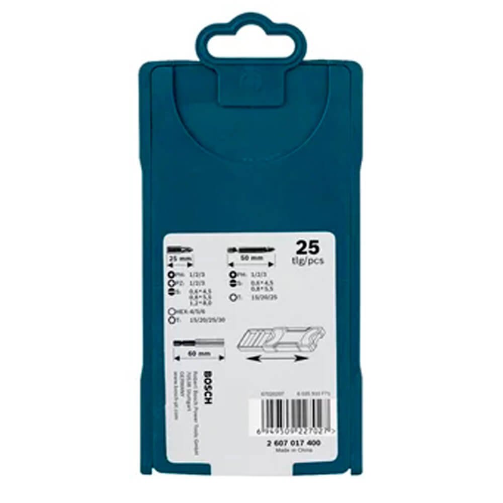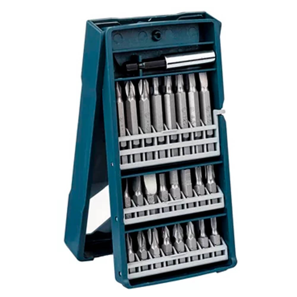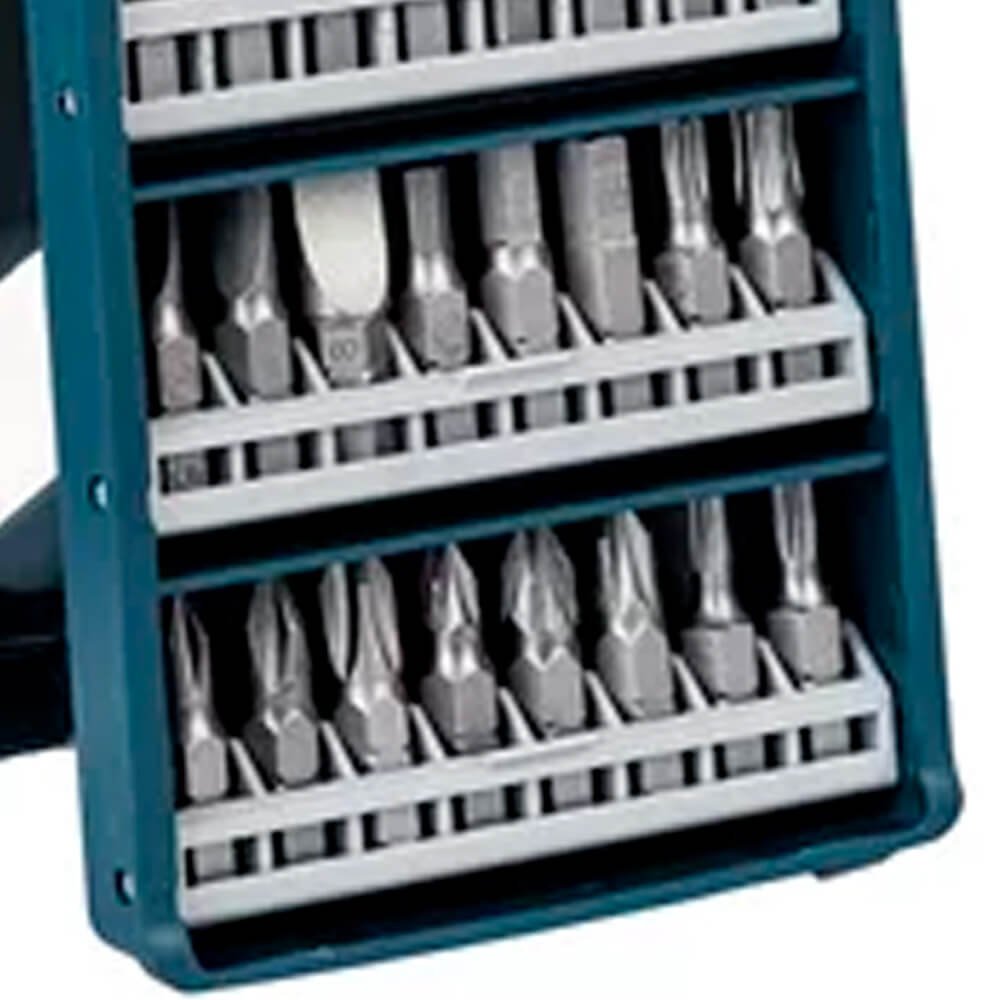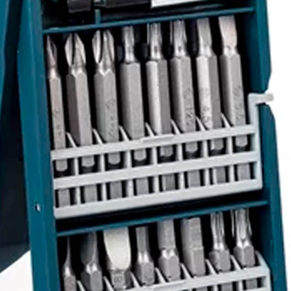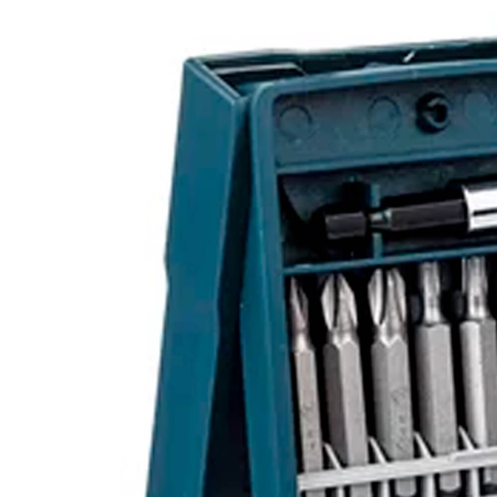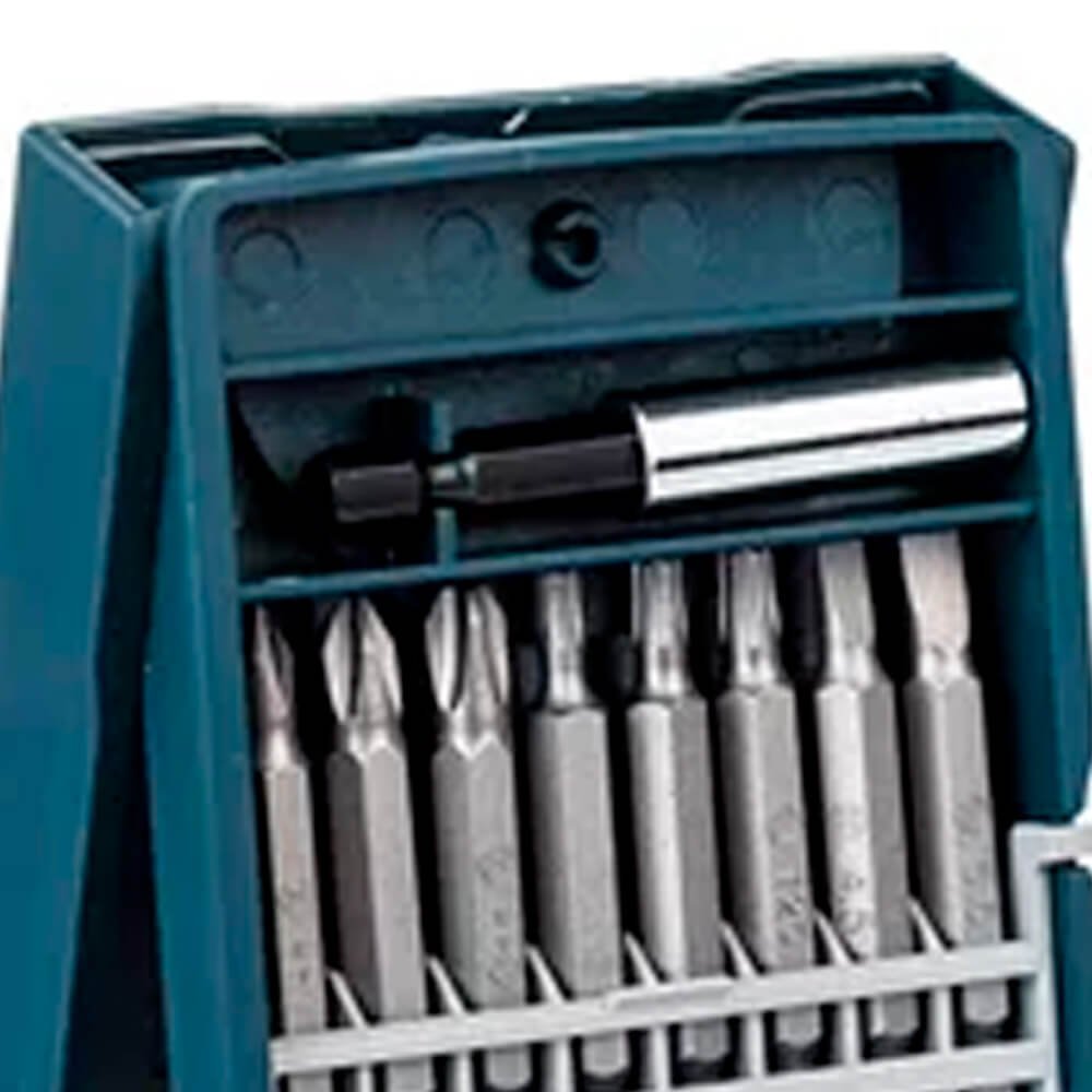 - 16 Pontas 25mm: PH1, PH2, PH3, PZ1, PZ2, PZ3, S4,5, S5,5, S8, HEX 4/5/6mm, T15, T20, T25, T30;