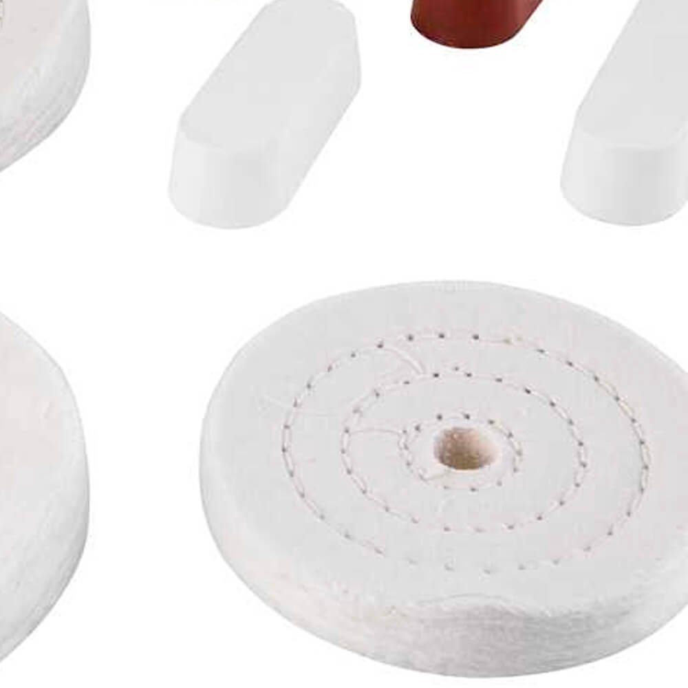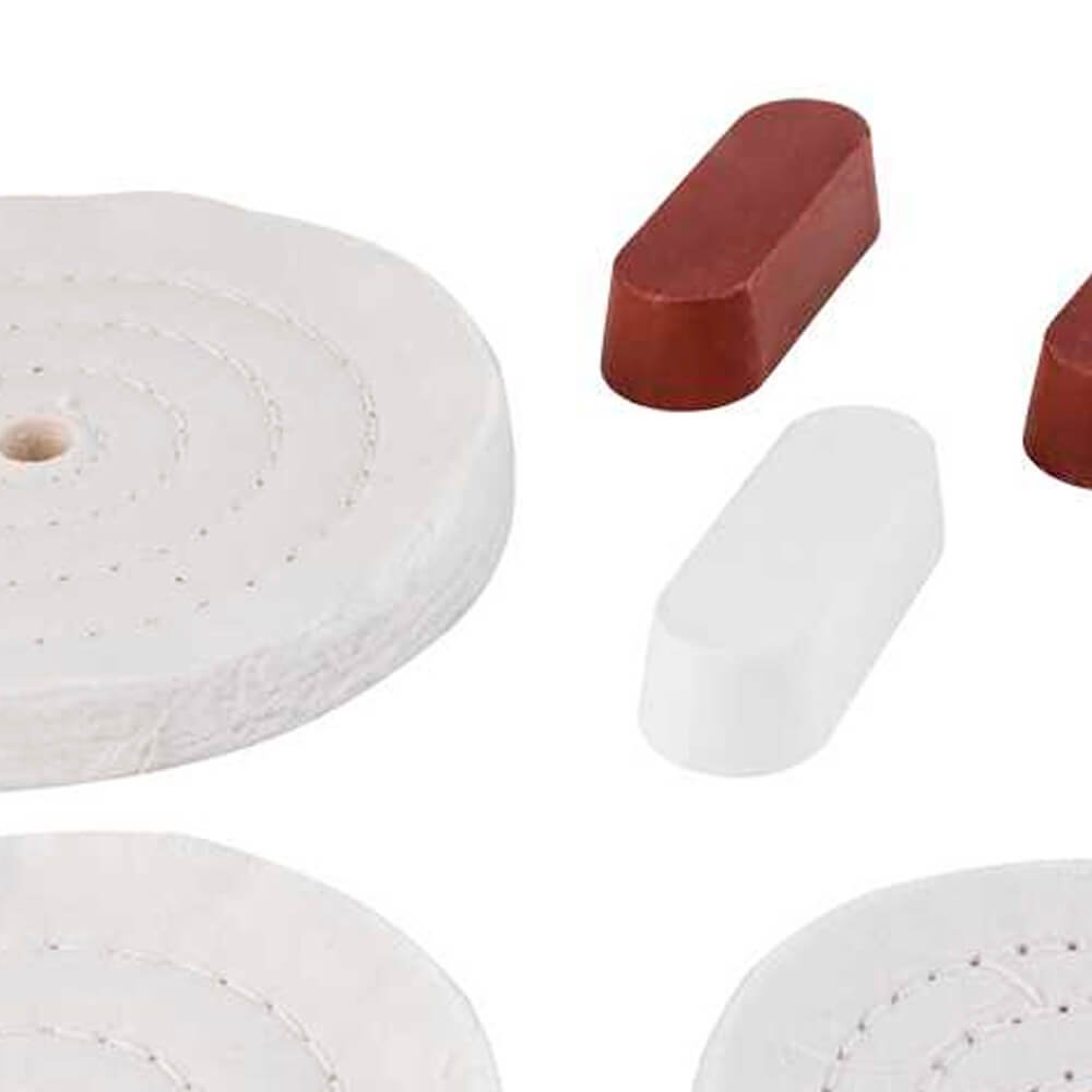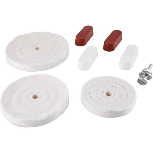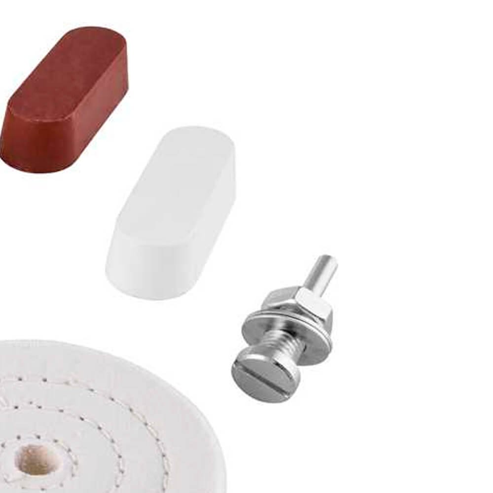 Conteúdo da Embalagem: 1 Jogo de rodas de pano, composto por: 1 roda de 100 mm, 1 roda de 125 mm e 1 roda de 150 mm de diâmetro, 1 haste adaptadora, 2 pastas para polimento branca e 2 pastas para polimento marrom.