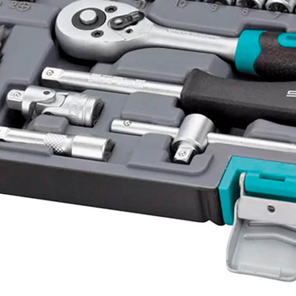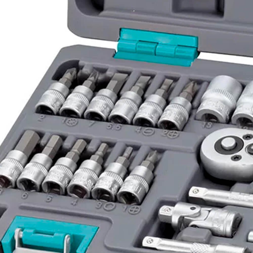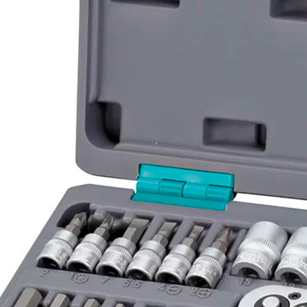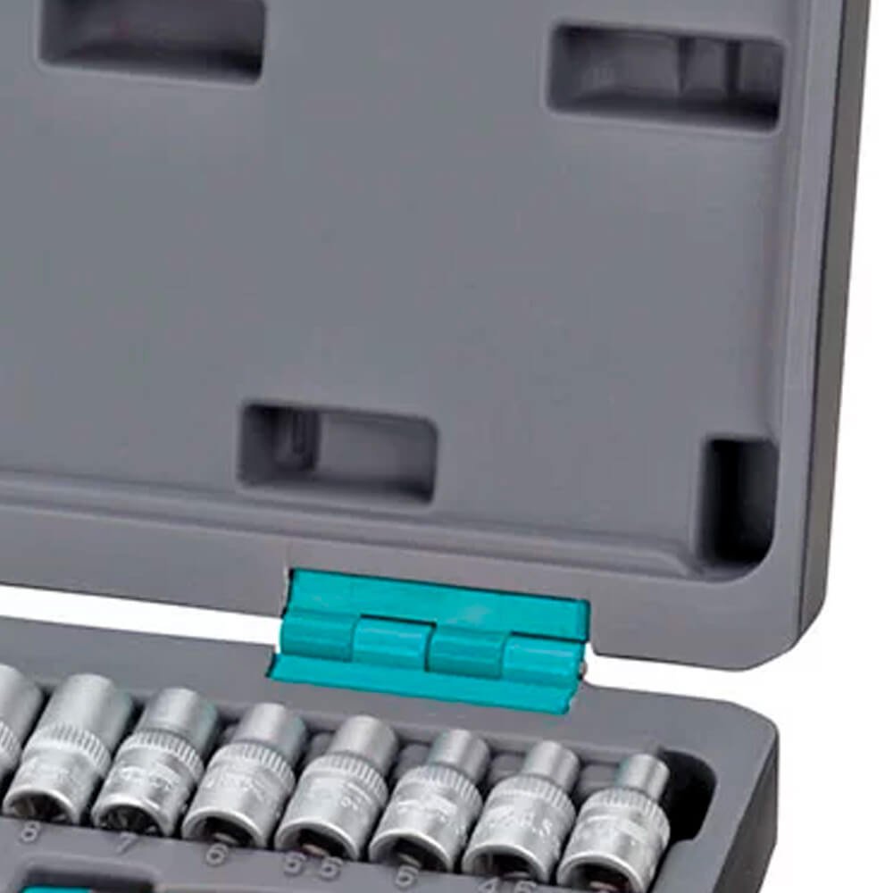 O jogo de soquetes e acesórios é composto por 29 peças de excelente qualidade em aço cromo vanádio, proporcionando maior durabilidade e resistência. Acompanha estojo de plástico para armazenamento das ferramentas.
