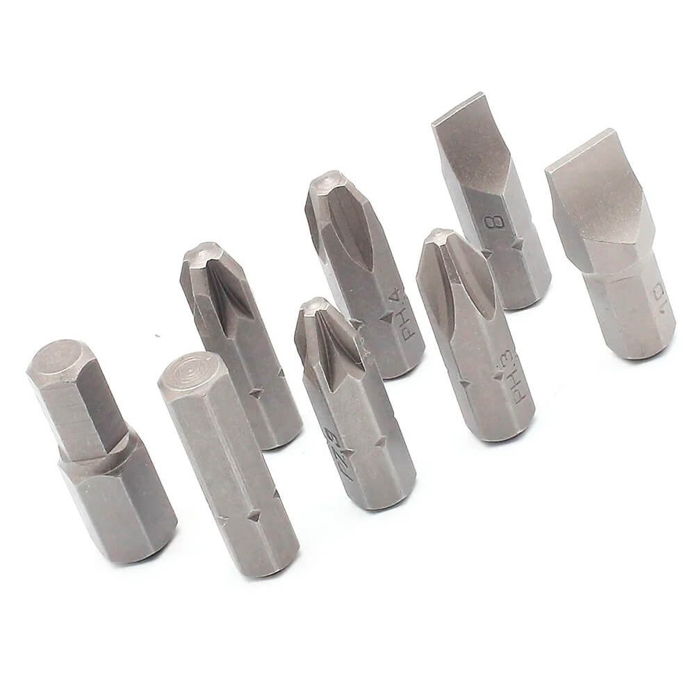 8 Bits: 2 Pozidriv: PZ3 e PZ4 / 2 Phillips: PH3 e PH4 / 2 Fenda: 8 e 10 mm / 2 Allen: 8 e 10 mm
