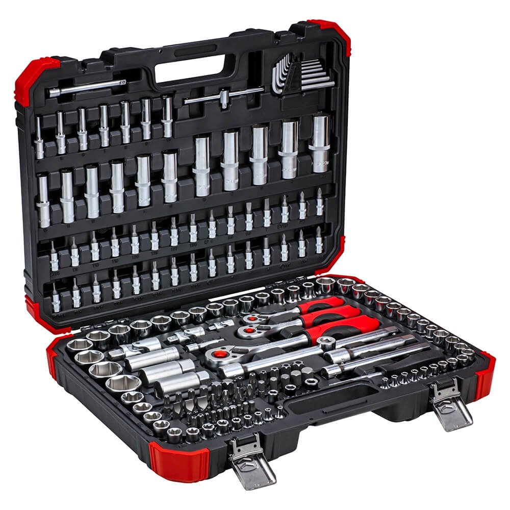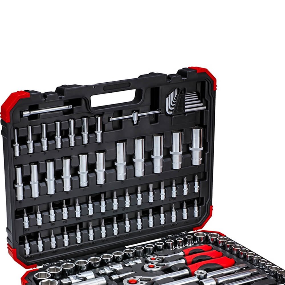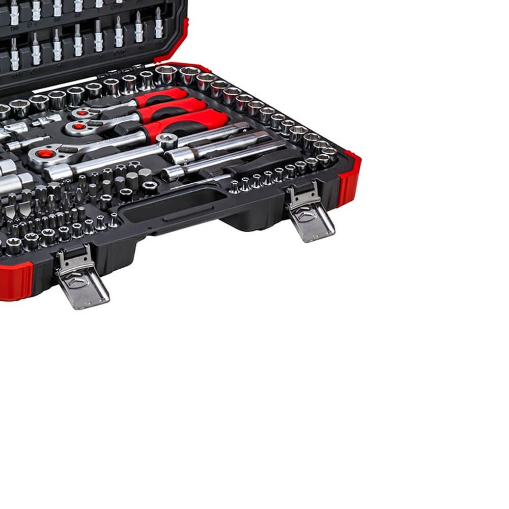 Reúne um mix de soquetes e acessórios de uso universal, que se encaixam em diversas medidas e tipos de cabeças de parafusos e porcas.